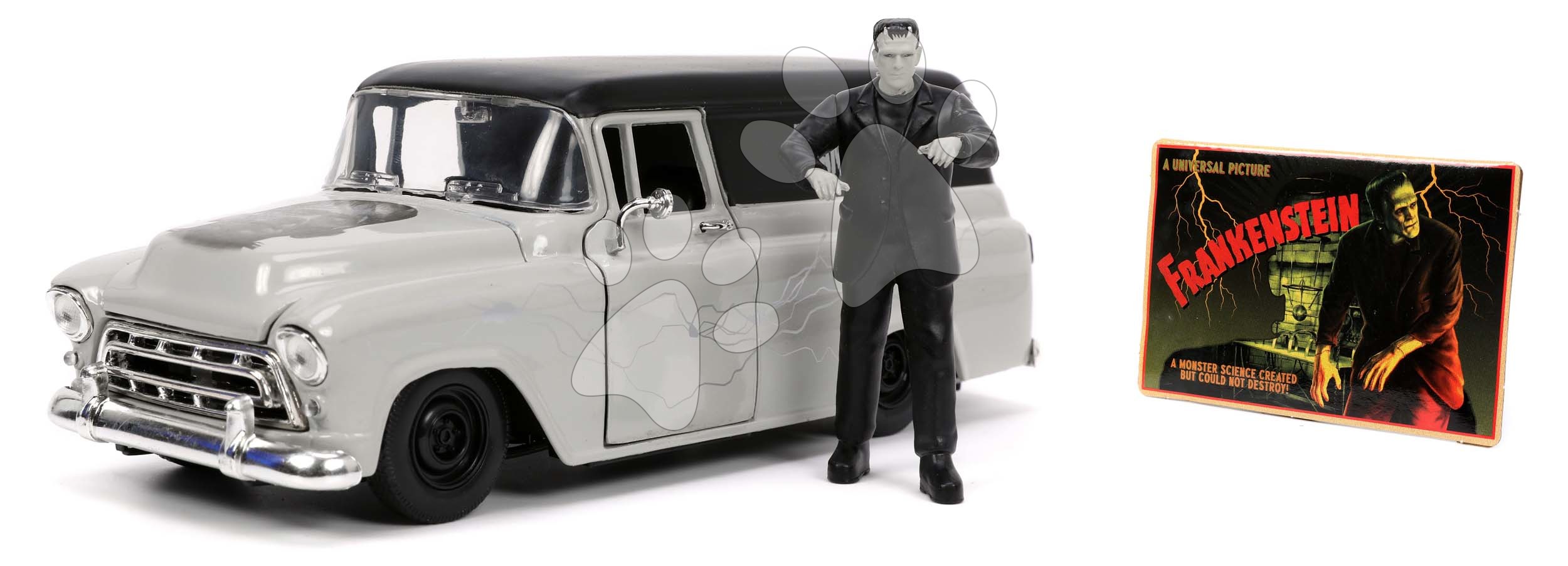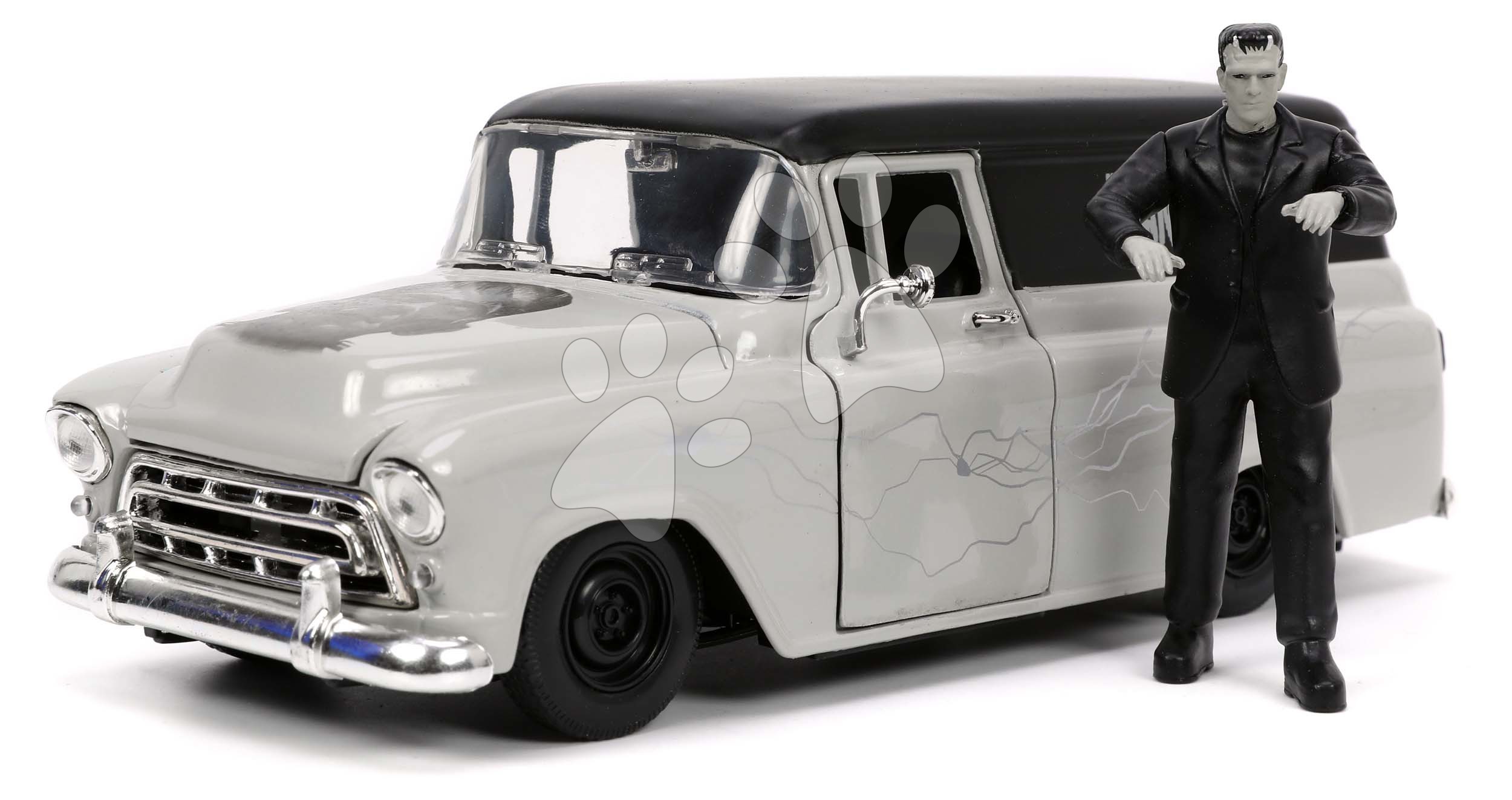 originální autíčka a figurky s filmovým motivem od Jada. kovové autíčko Chevy Suburban 1957 s otevíracími částmi a figurkou Frankensteina potěší děti od 8 let.