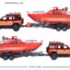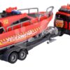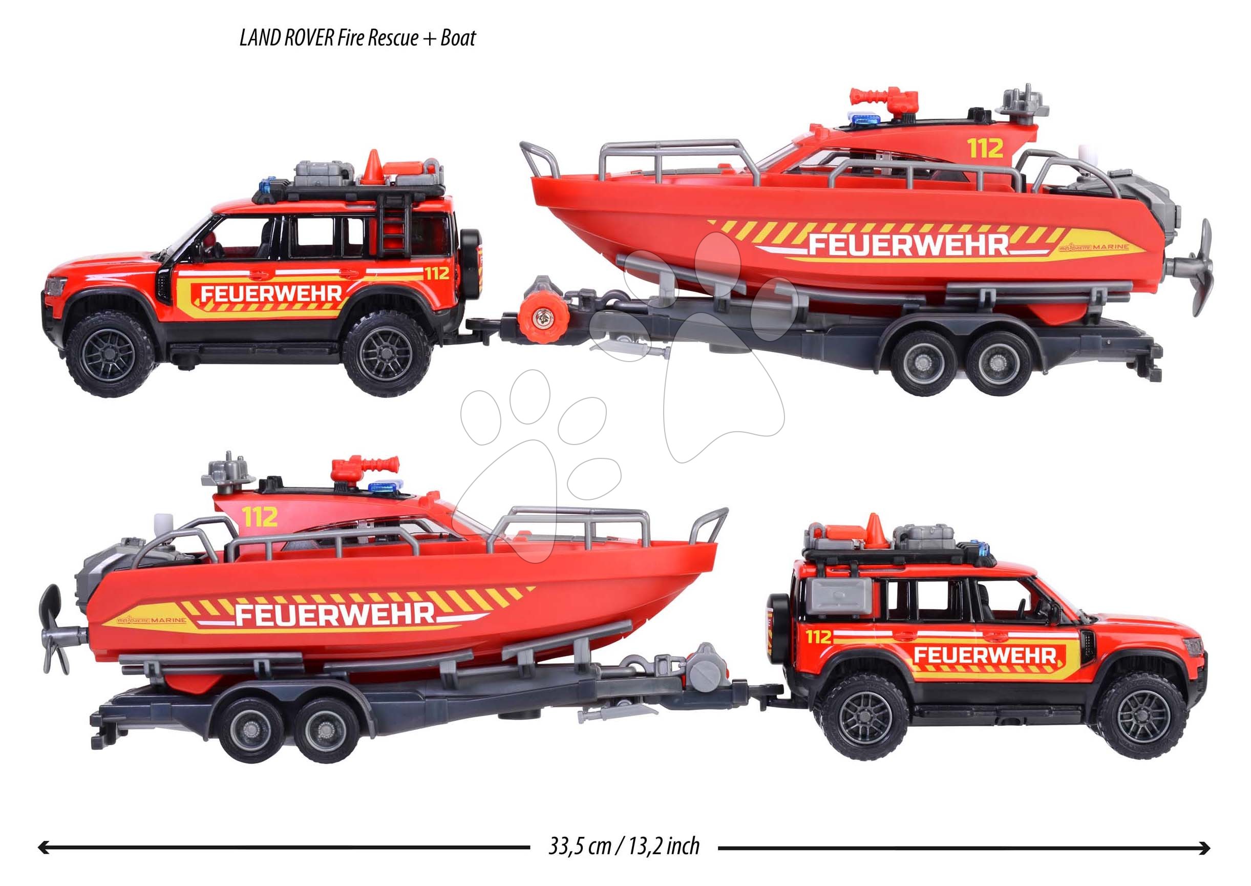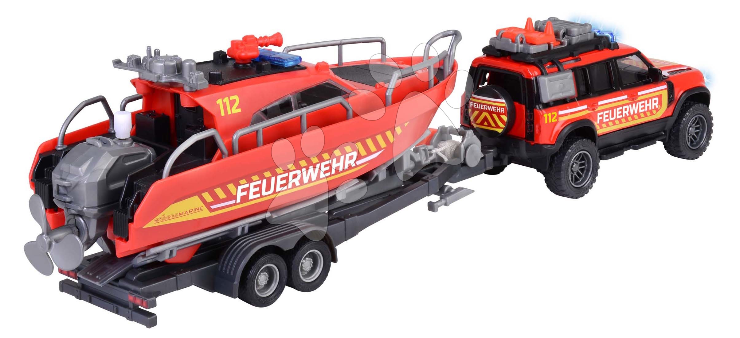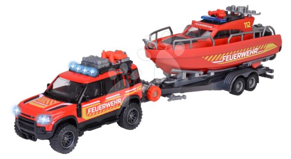 Autíčko hasičské s přívěsem a lodí Land Rover Fire Rescue Majorette kovové se zvukem a světlem délka 33,5 cm
