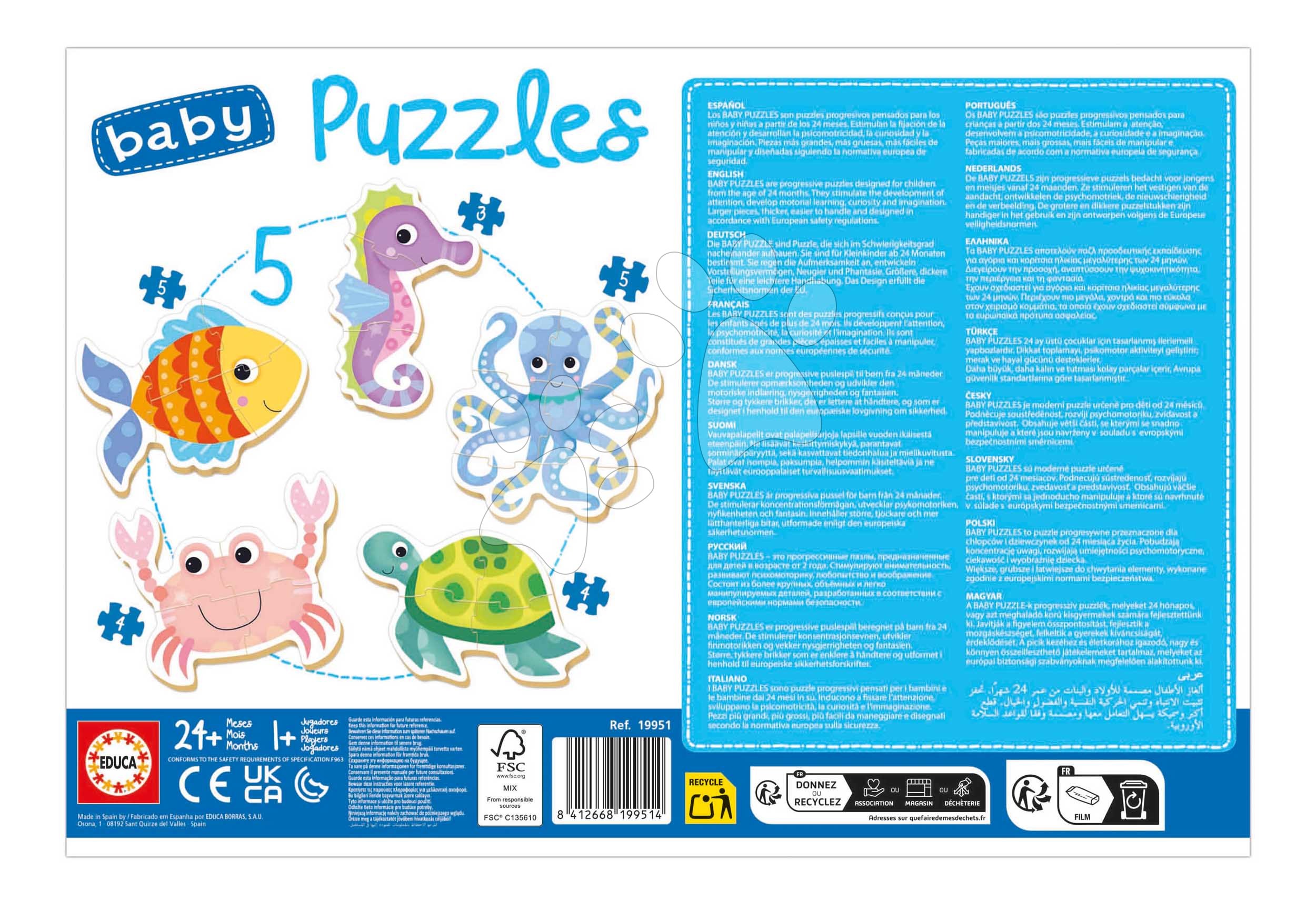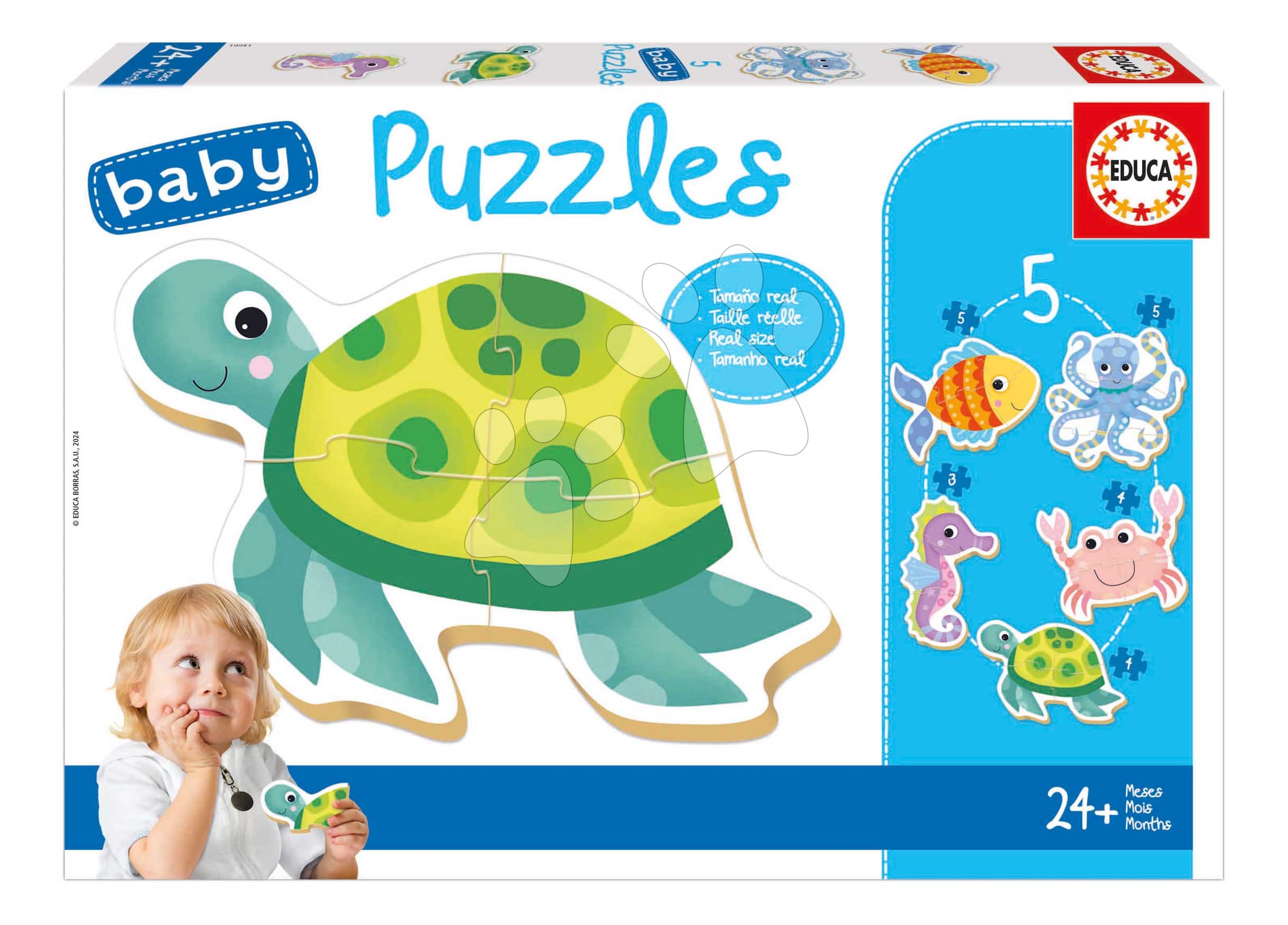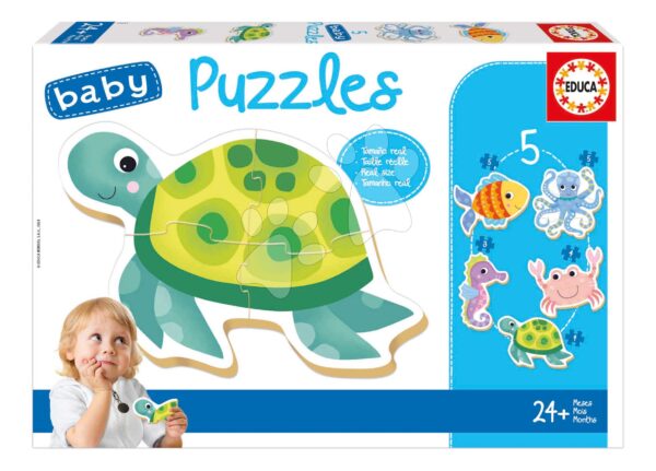 Prvotřídní puzzle pro nejmenší od Educa. Puzzle baby Puzzles s motivem mořských zvířátek obsahují až 5 krásných obrázků, které mohou skládat děti od 2 let.