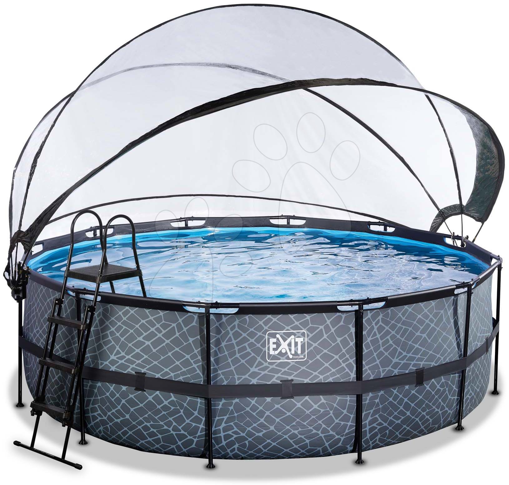 Robustní bazény do zahrady od Exit Toys. bazén s krytem, pískovou filtrací a tepelným čerpadlem Stone pool má rozměry 427*122 cm.