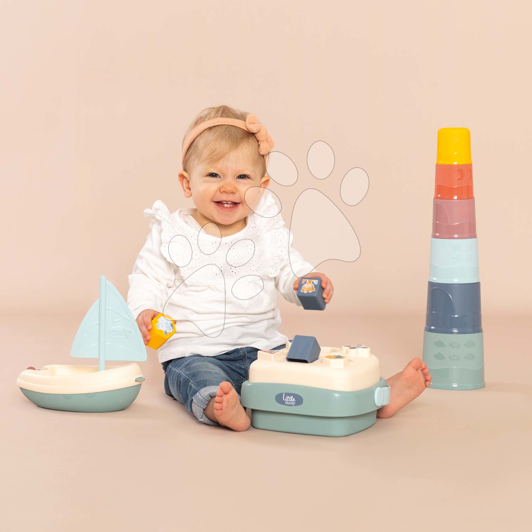 Didaktický košík s plachetnicí a skládací věží Awakenings and Bath Set Little Smoby s 8 kostkami a 6 kelímky pro jemnou motoriku od 12 měsíců