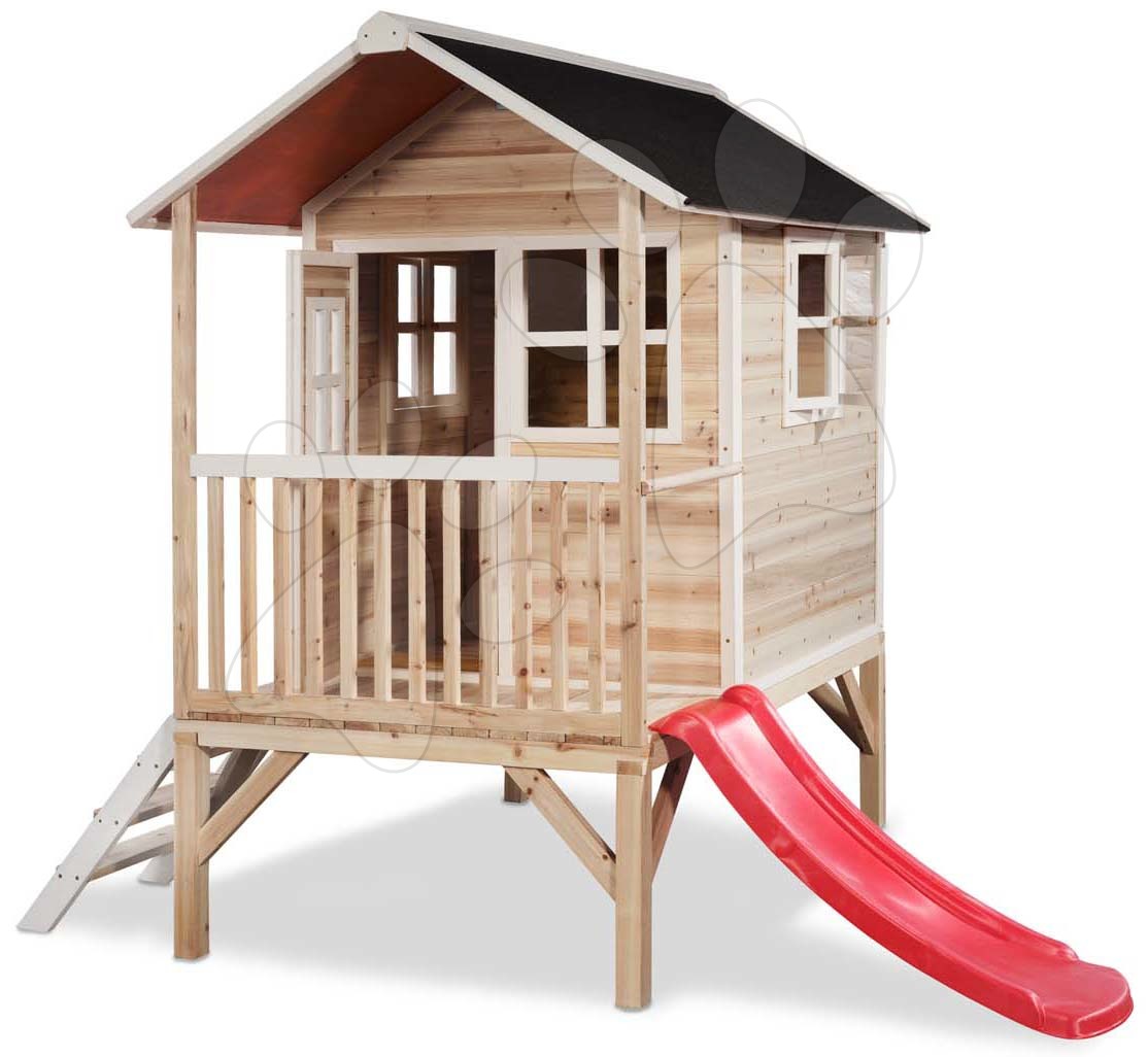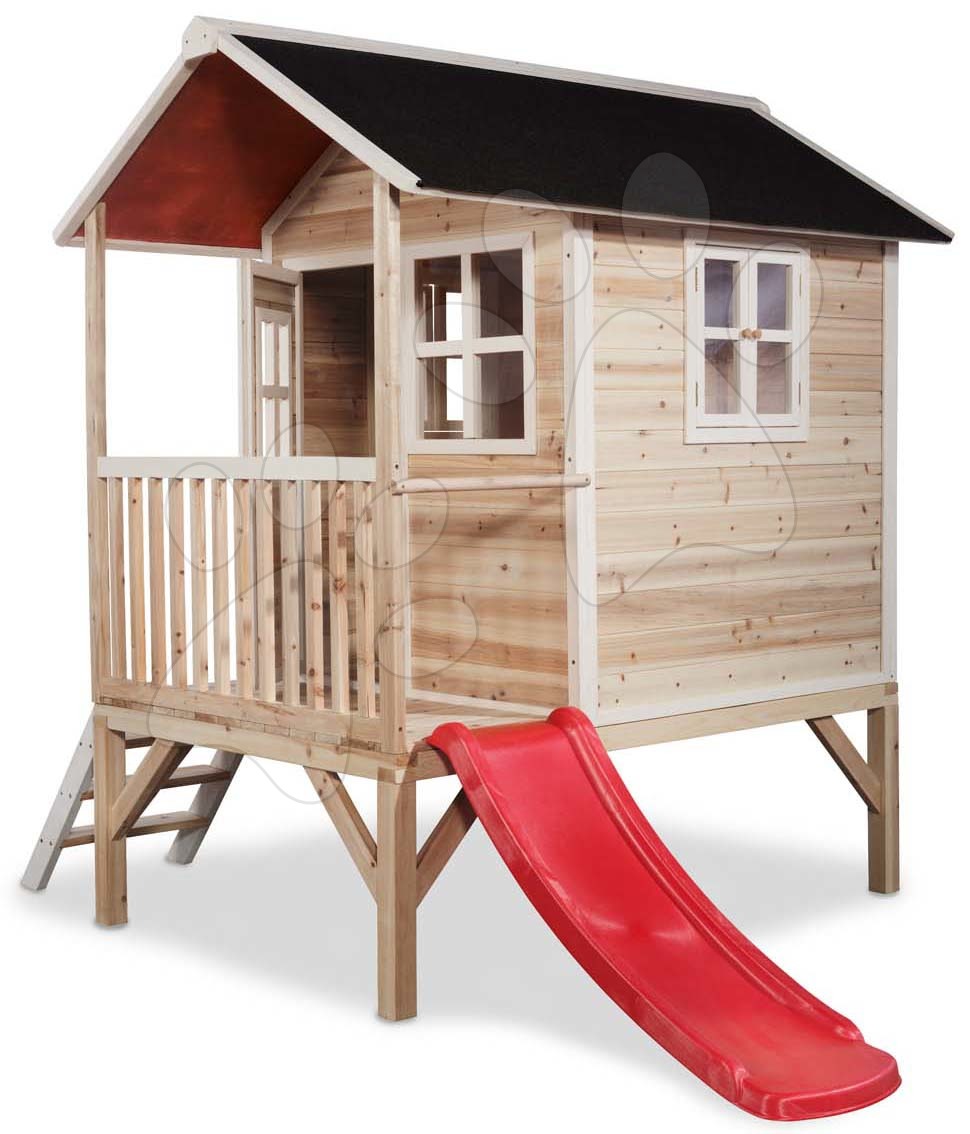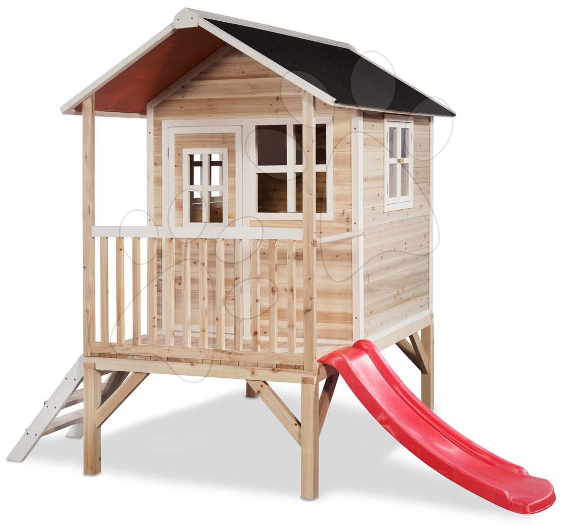Špičkové dřevěné domečky od Exit Toys. domeček cedrový na pilířích Loft 300 s voděodolnou střechou a skluzavkou potěší každé dítě od 3 let.