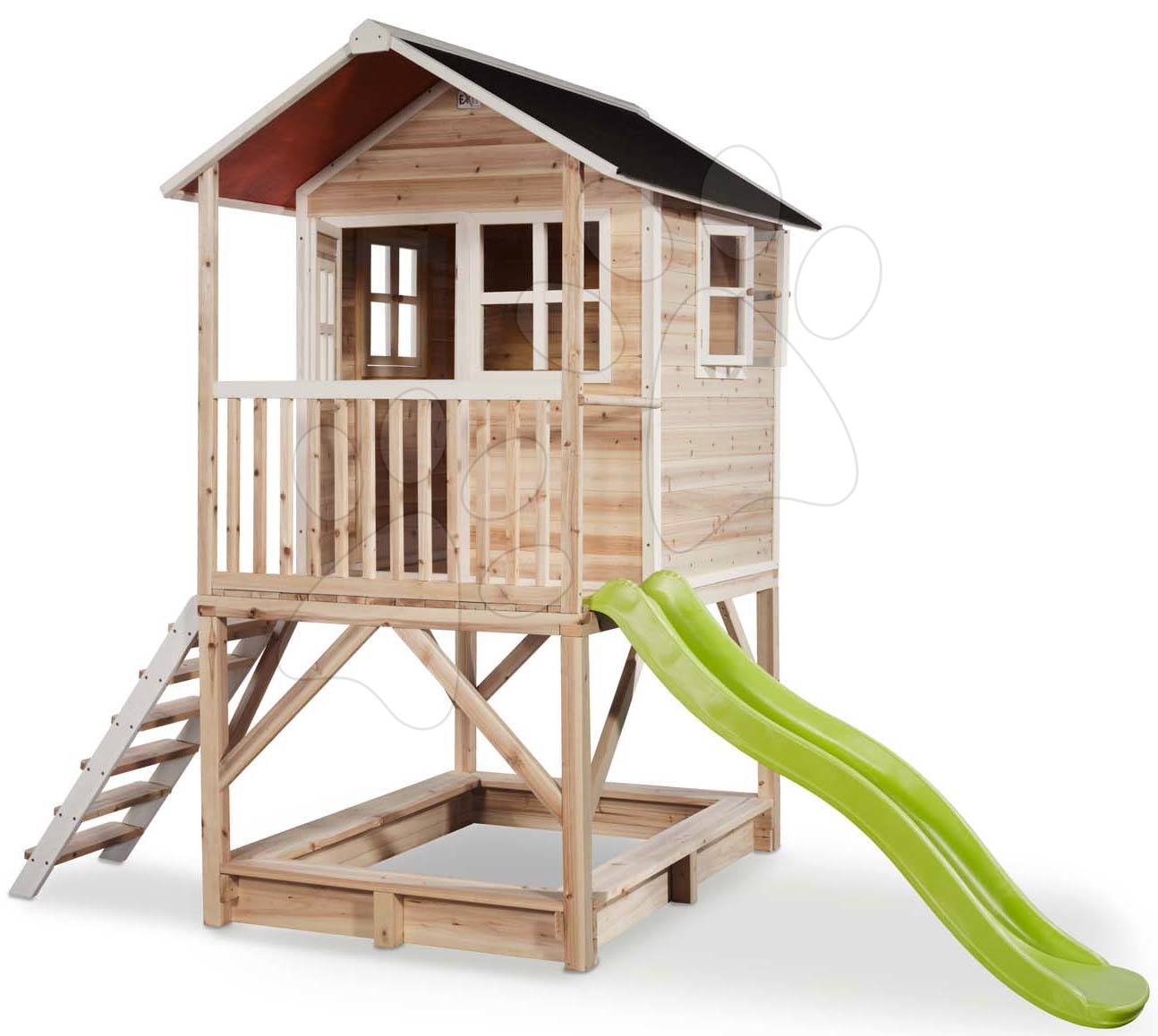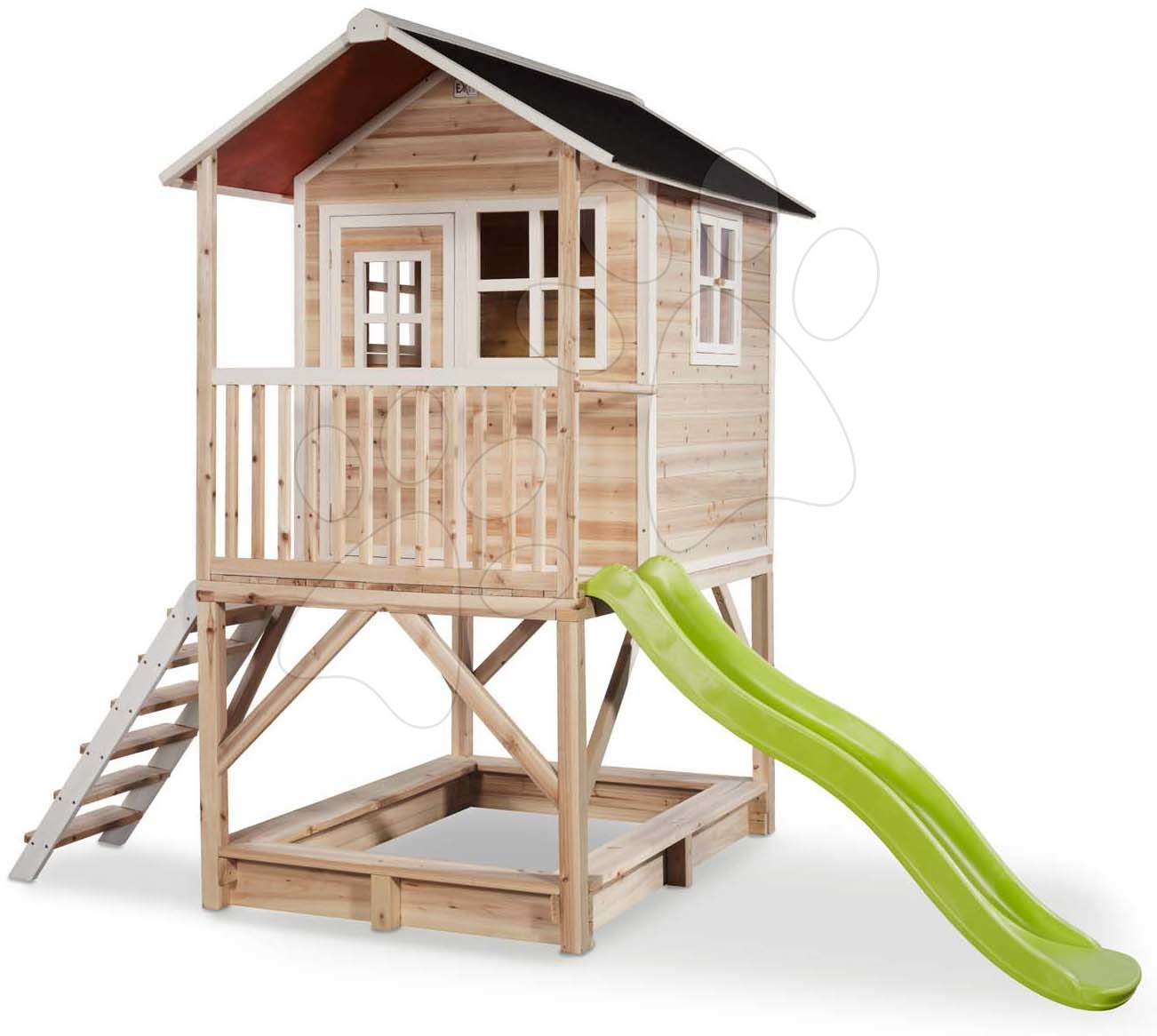 Domeček cedrový na pilířích Loft 500 Natural Exit Toys s voděodolnou střechou pískovištěm a 1,75 m skluzavkou přírodní