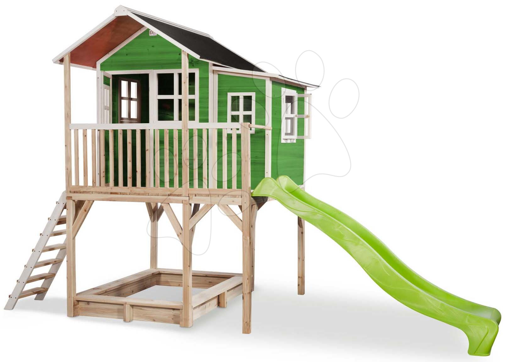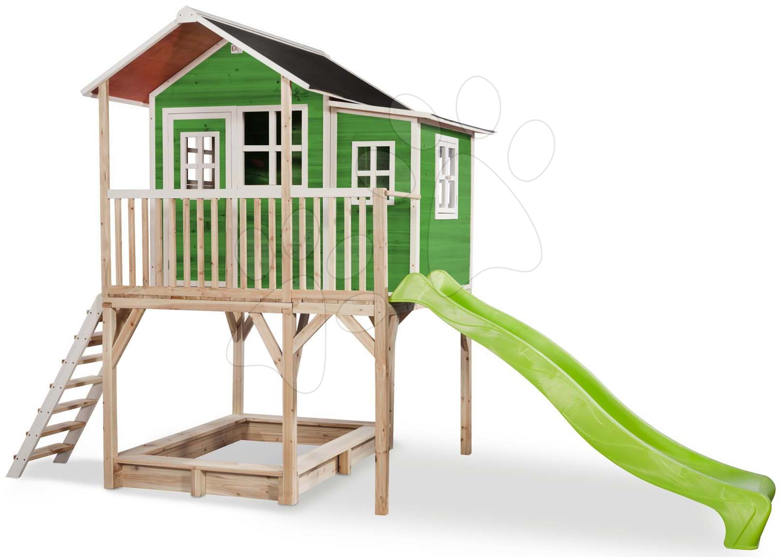 Domeček cedrový na pilířích Loft 750 Green Exit Toys velký s voděodolnou střechou pískovištěm a 2,28 m skluzavkou zelený