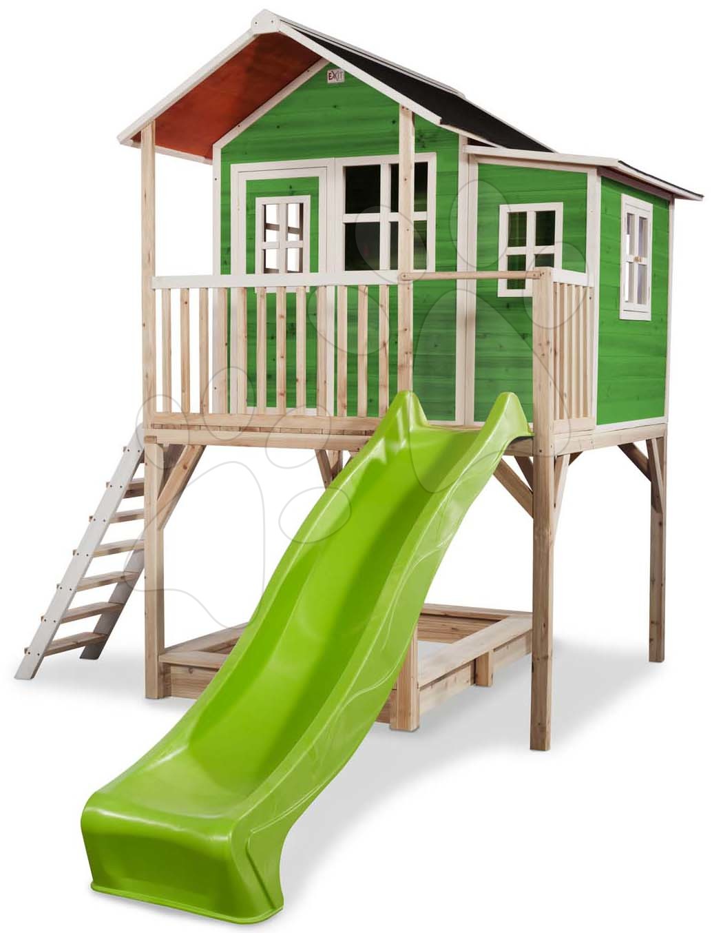 Dřevěné domečky pro děti od Exit Toys. domeček cedrový na pilířích Loft 750 Green s pískovištěm a skluzavkou zabaví chlapce i dívky od 3 let.