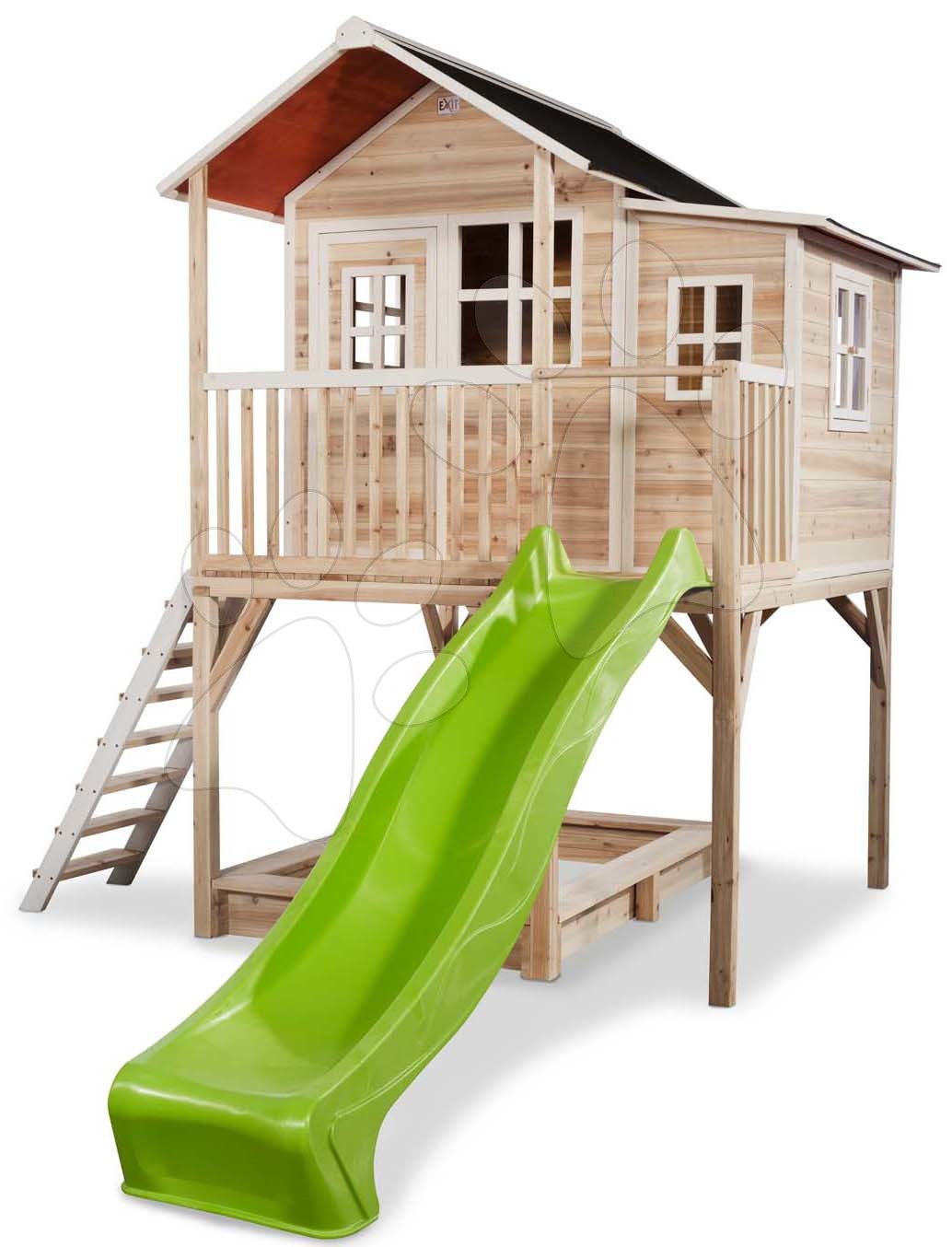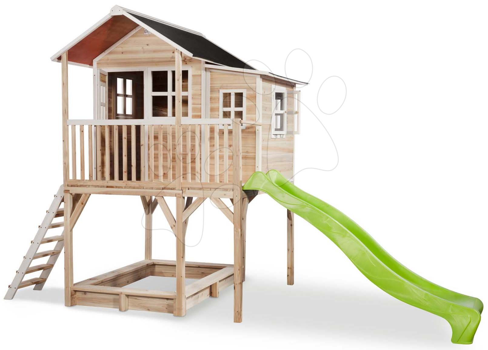 Dětské domečky s holandským designem Exit Toys. domeček cedrový na pilířích Loft 750 natural s pískovištěm a skluzavkou nabídne dětem extra prostor pro hraní.