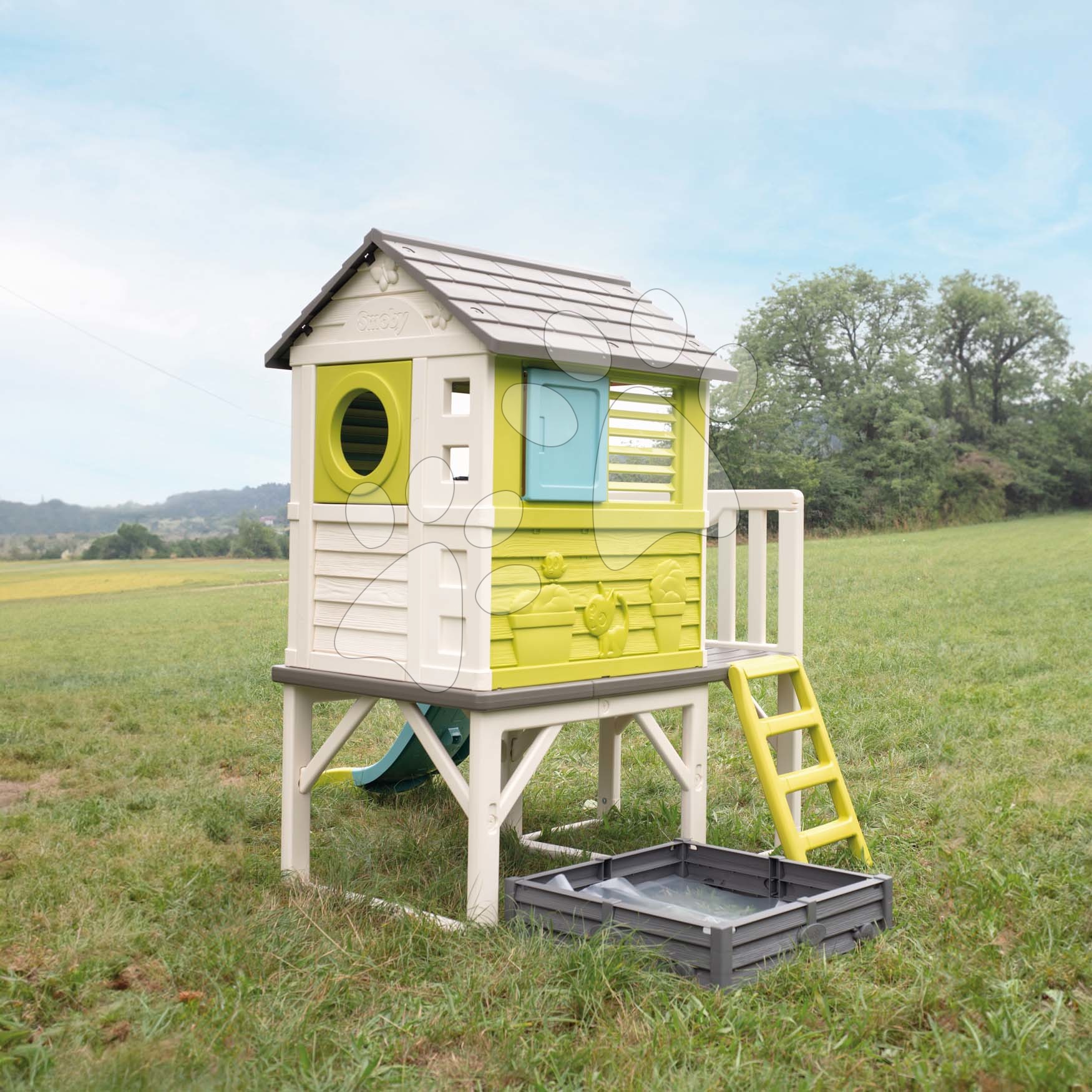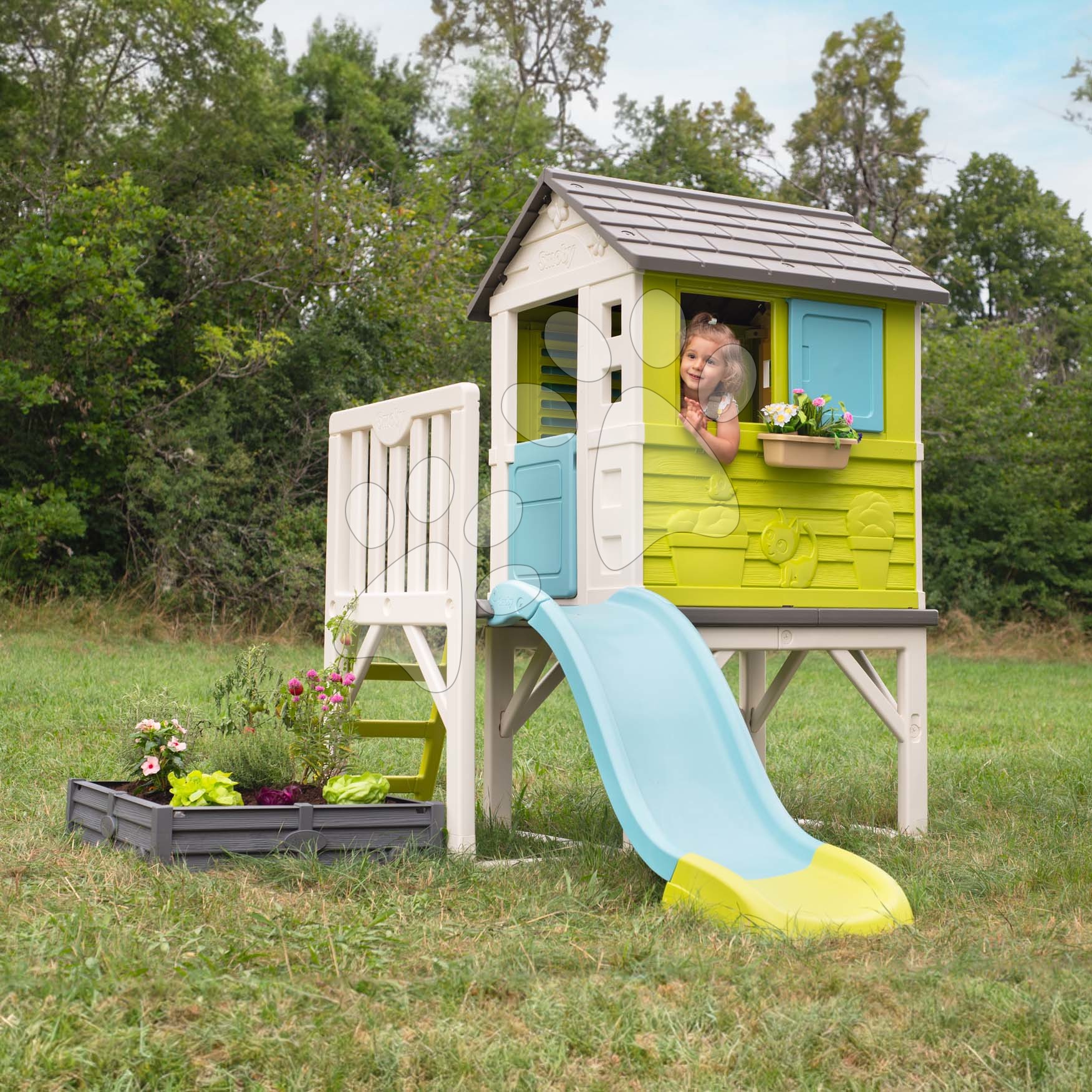Domeček na pilířích s pískovištěm zahrádkou Square Playhouse on Stilts Smoby a 1,5 m skluzavka s žebříkem UV filtr od 24 měsíců