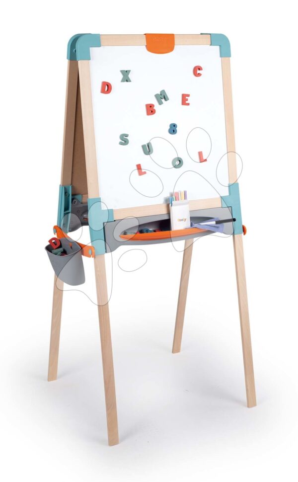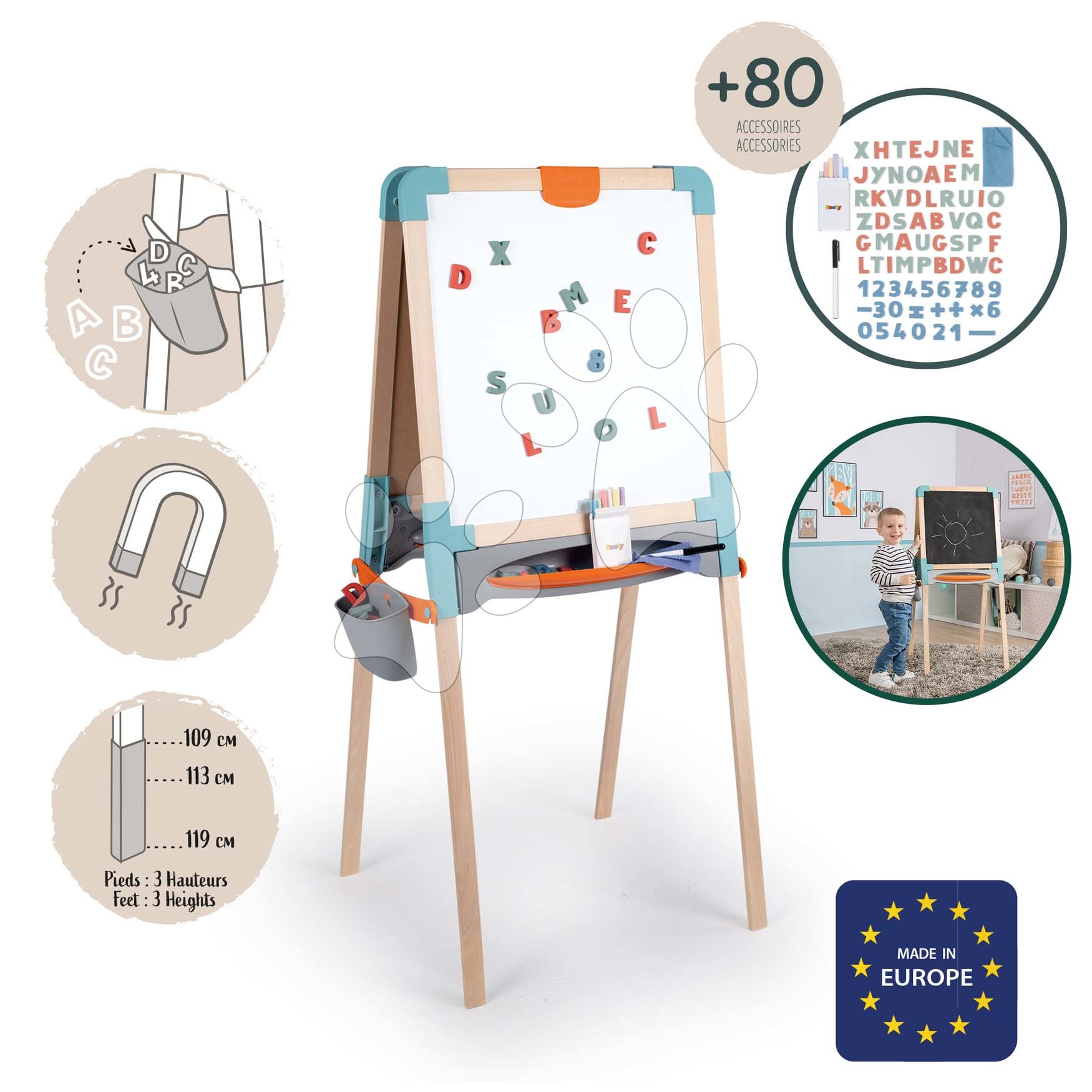 Dřevěná tabule oboustranná Wooden Board Smoby magnetická/na křídu výškově nastavitelná skládací s 80 doplňky