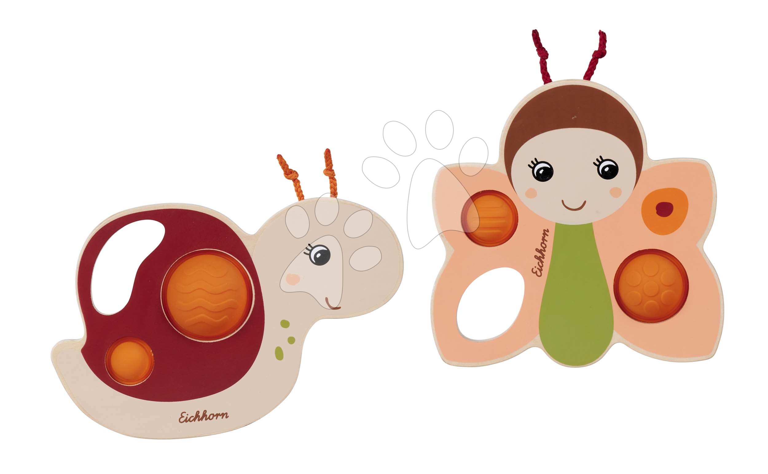 klasické dřevěné figurky přináší německý výrobce Eichhorn. Dřevěné figurky ve tvaru šnečka a motýla jsou vyrobeny z prvotřídního dřeva a silikonu, umožňují dětem rozvíjet kognitivní schopnosti.