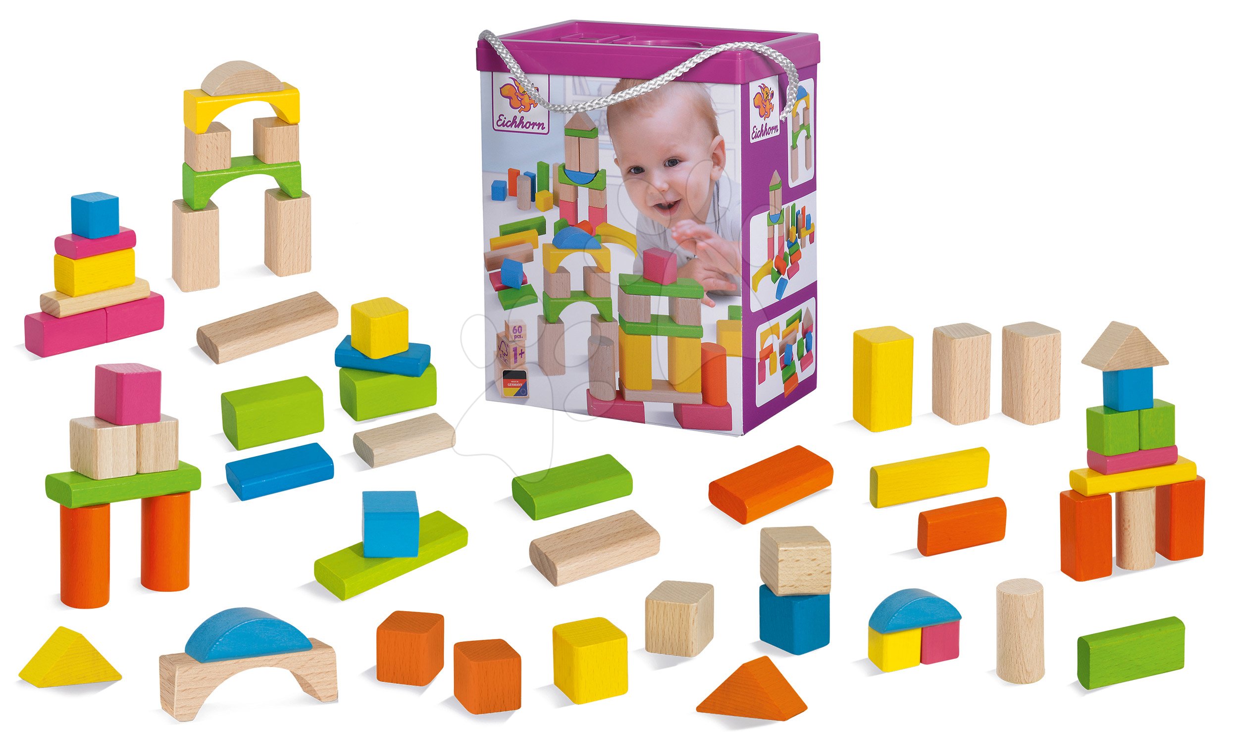 S dřevěnými kostkami Eichhorn potěšíte každé dítě. Mix 50 kusů barevných a přírodních dřevěných kostek pomůže dětem od 12 měsíců rozvíjet jejich fantazii.
