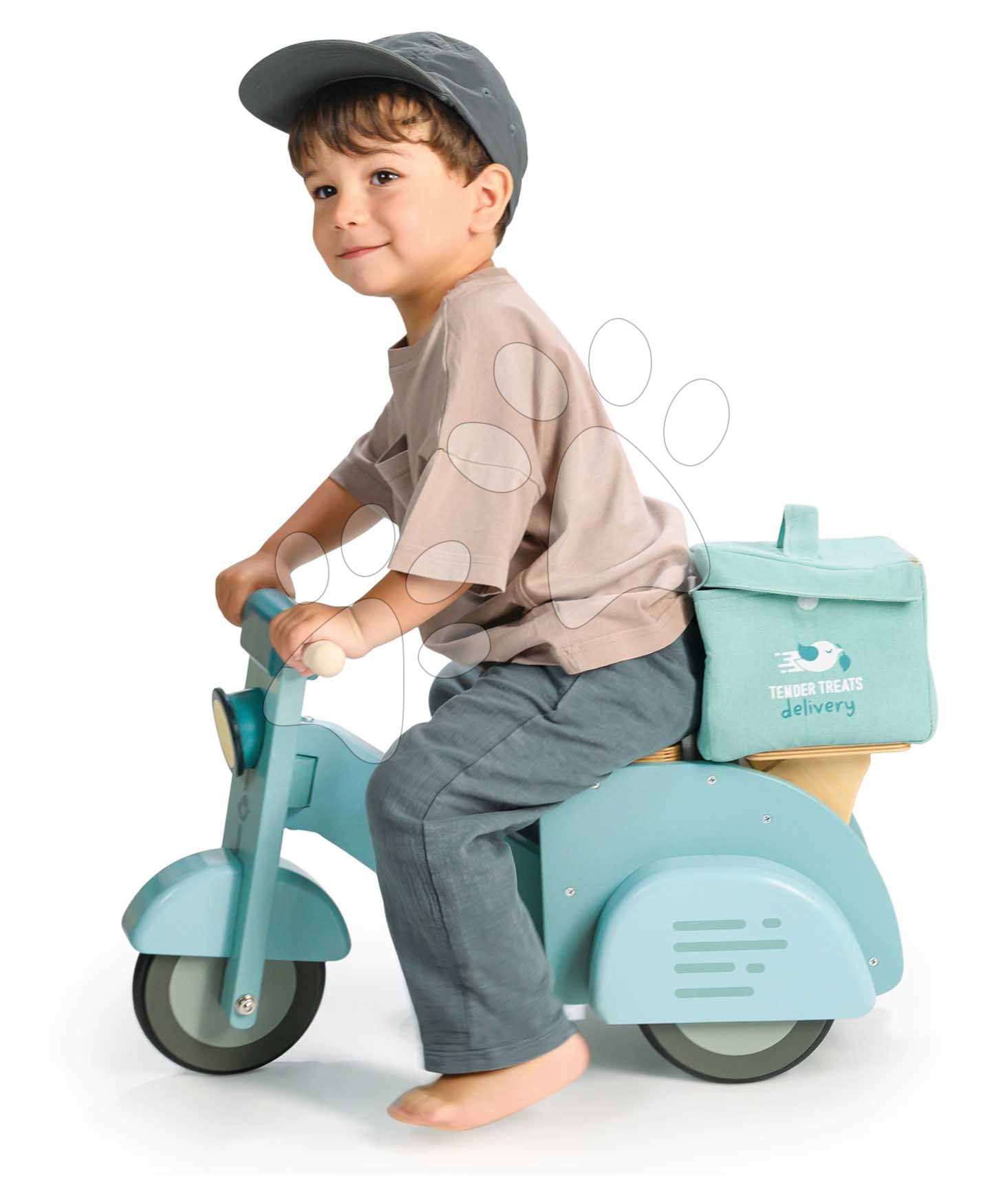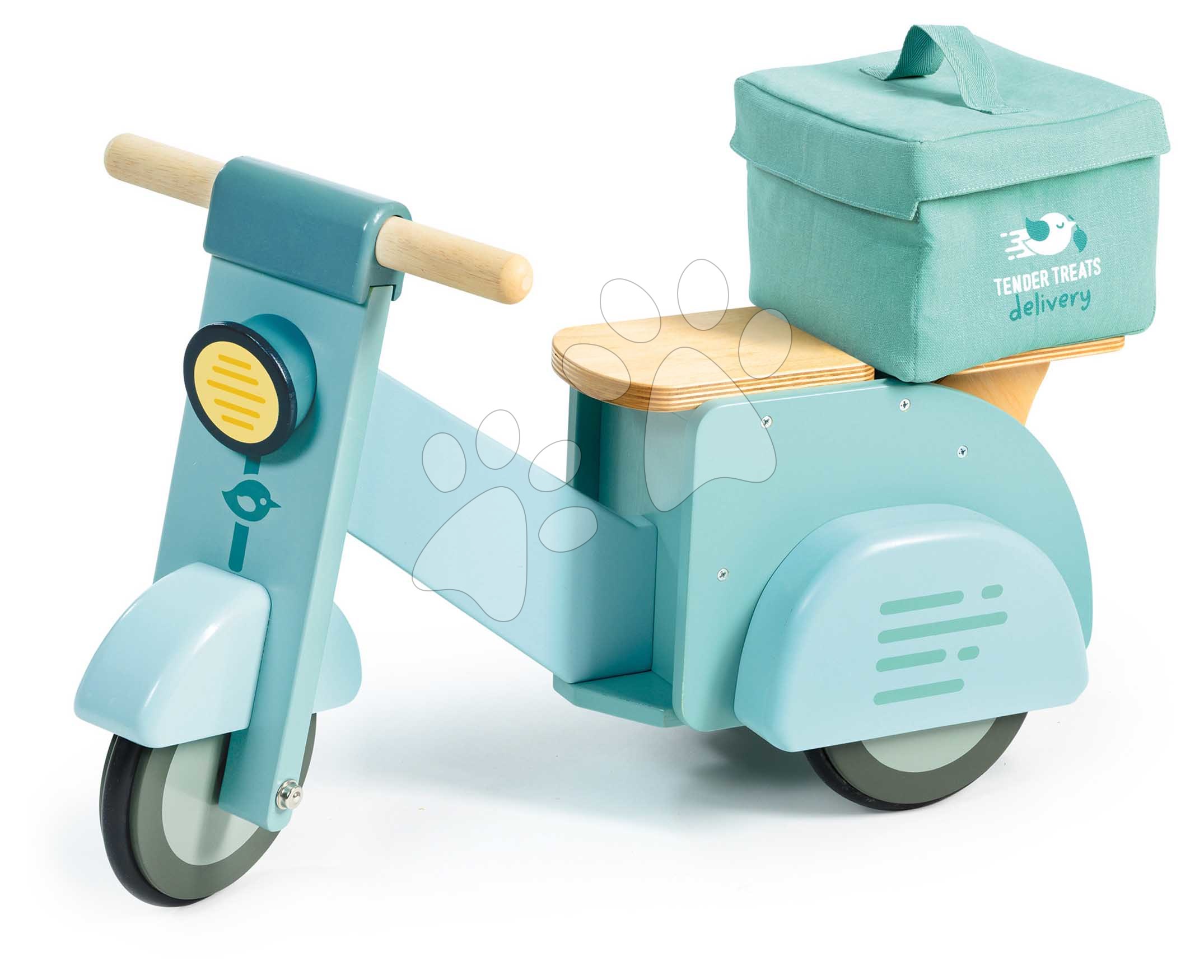 Dřevěné odrážedlo Donáška jídla Delivery Scooter Tender Leaf Toys s gumovými koly a plátěná taška od 24 měsíců