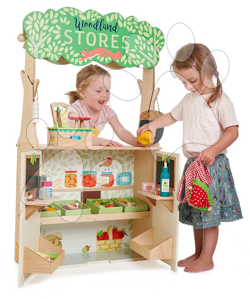 Dřevěný lesní obchod s divadlem Woodland Stores and Theatre Tender Leaf Toys s loutkami a taškou