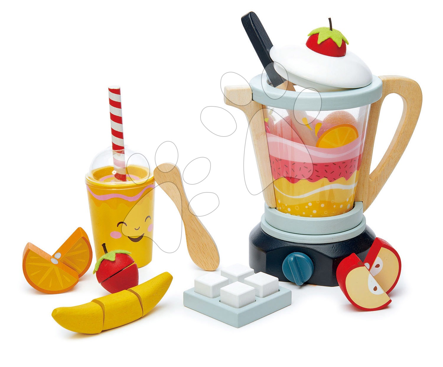Dřevěný mixér Fruity Blender Tender Leaf Toys s kelímkem, ovocem a kostky ledu
