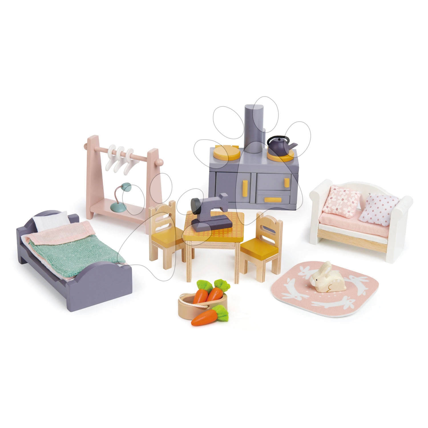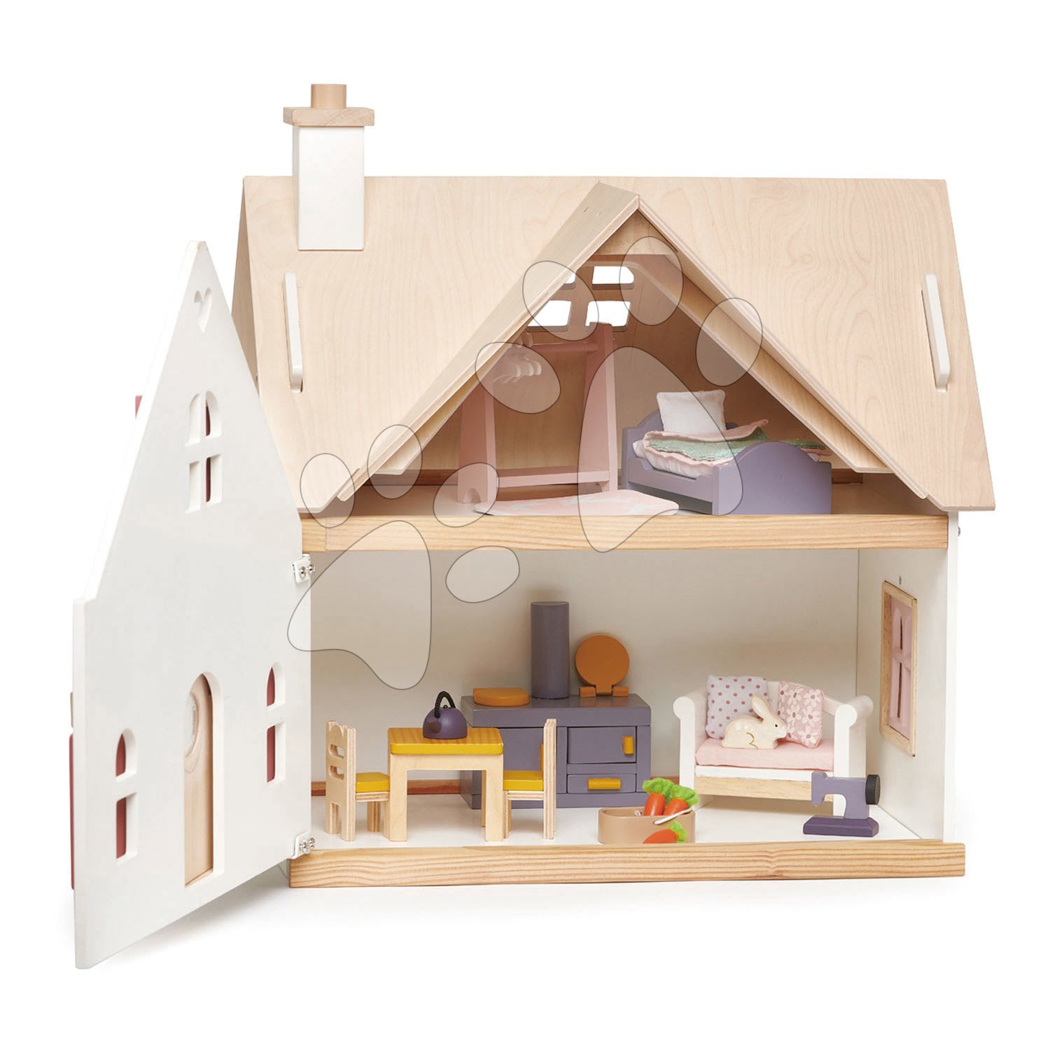 stylové venkovské domky ze dřeva pro panenky od Tender Leaf. Dřevěný venkovský domek Cottontail Cottage nabídne dětem 13 dílů s retro nábytkem.
