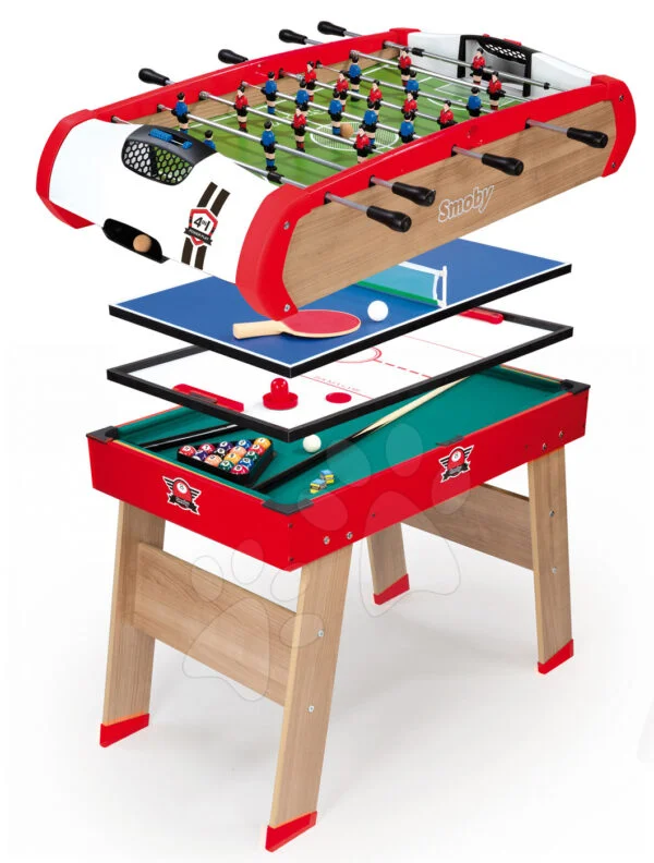 Fotbalový stůl Powerplay 4v1 Smoby dřevěný a kulečník, hokej, stolní tenis hrací plocha 94*60 cm od 8 let