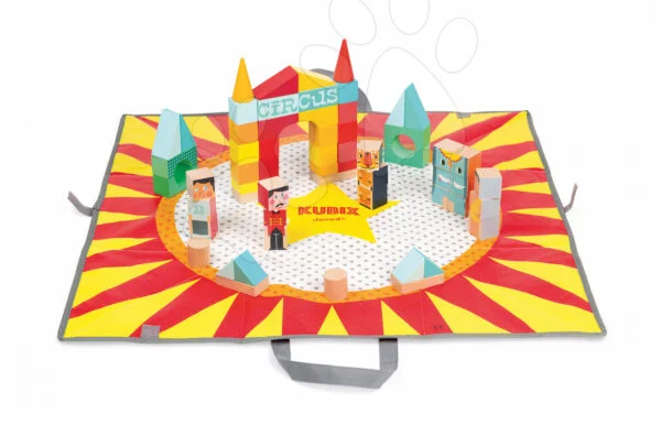 Oblibuje vaše děťátko hru s kostkami? Dřevěné kostky na podložce Cirkus Kubix Janod s 60 různými kostkami ho nepochybně osloví
