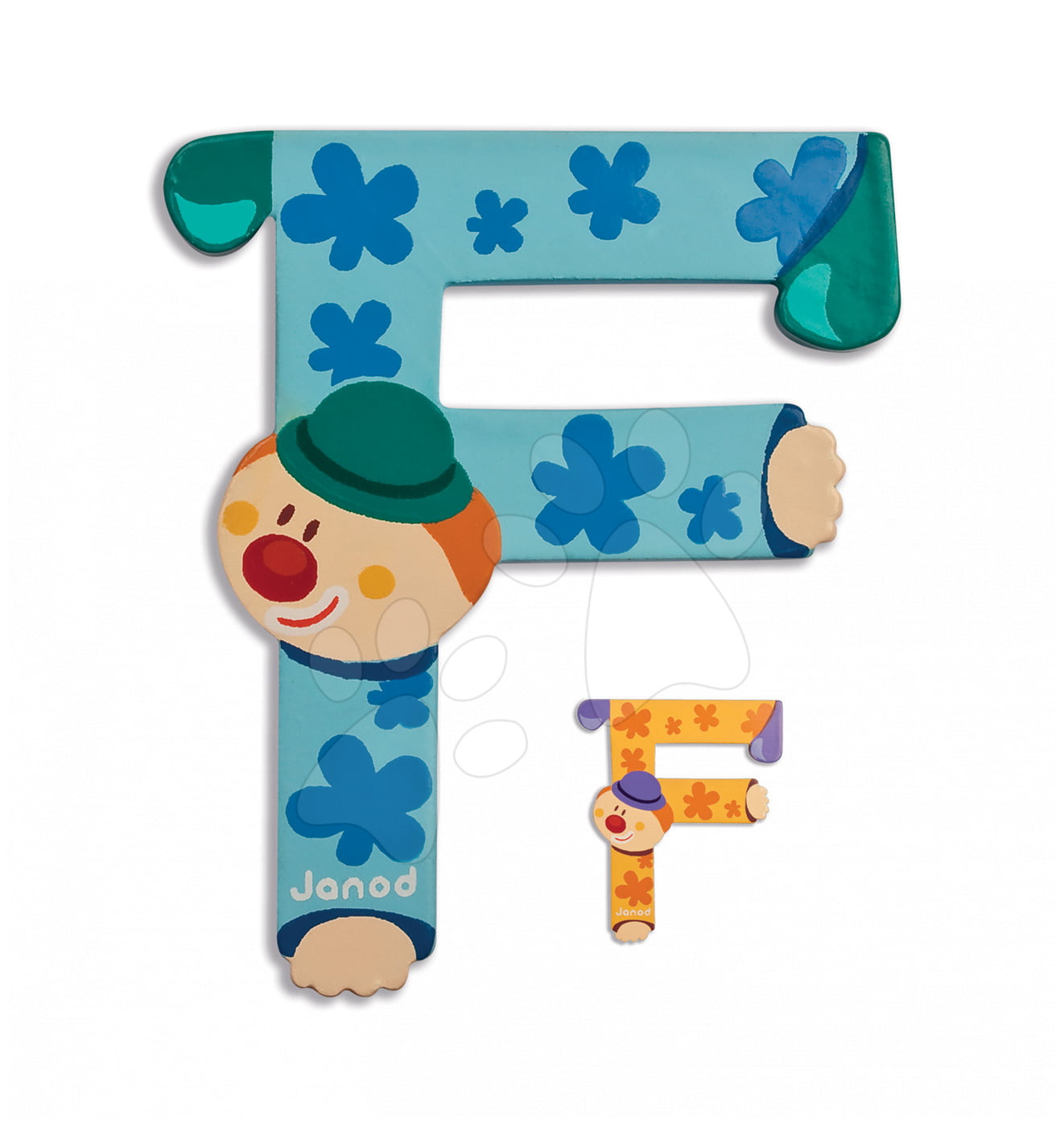 Toužíte děťátku vyzdobit pokojíček jeho jménem? Janod vám nabízí dřevěná písmena ve veselých barvách s motivem šaška. Písmeno F Clown Letter lze nalepit na stěnu.