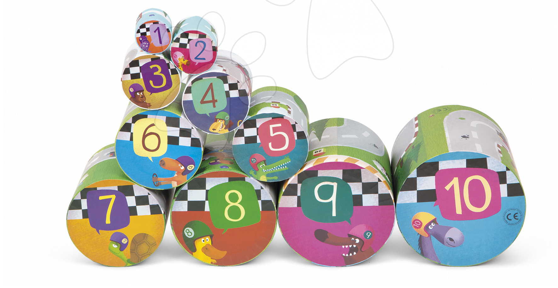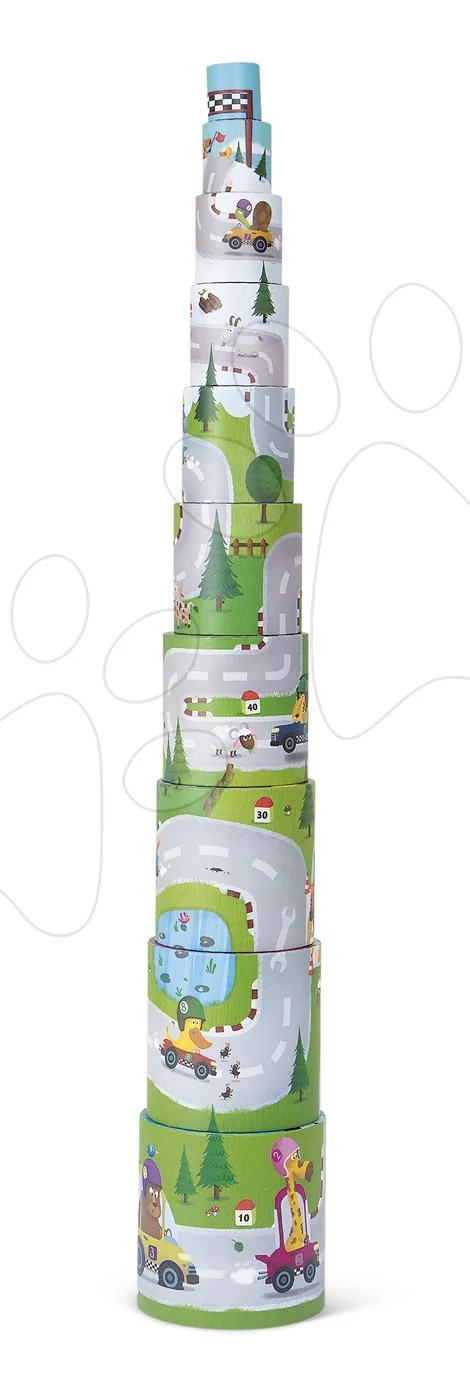Máte doma děťátko, které má rádo skládačky? skládací pyramida Janod je zajímavá skládačka s závodním motivem. Tvoří ji 10 dílků, které se skládají na sebe do výšky.