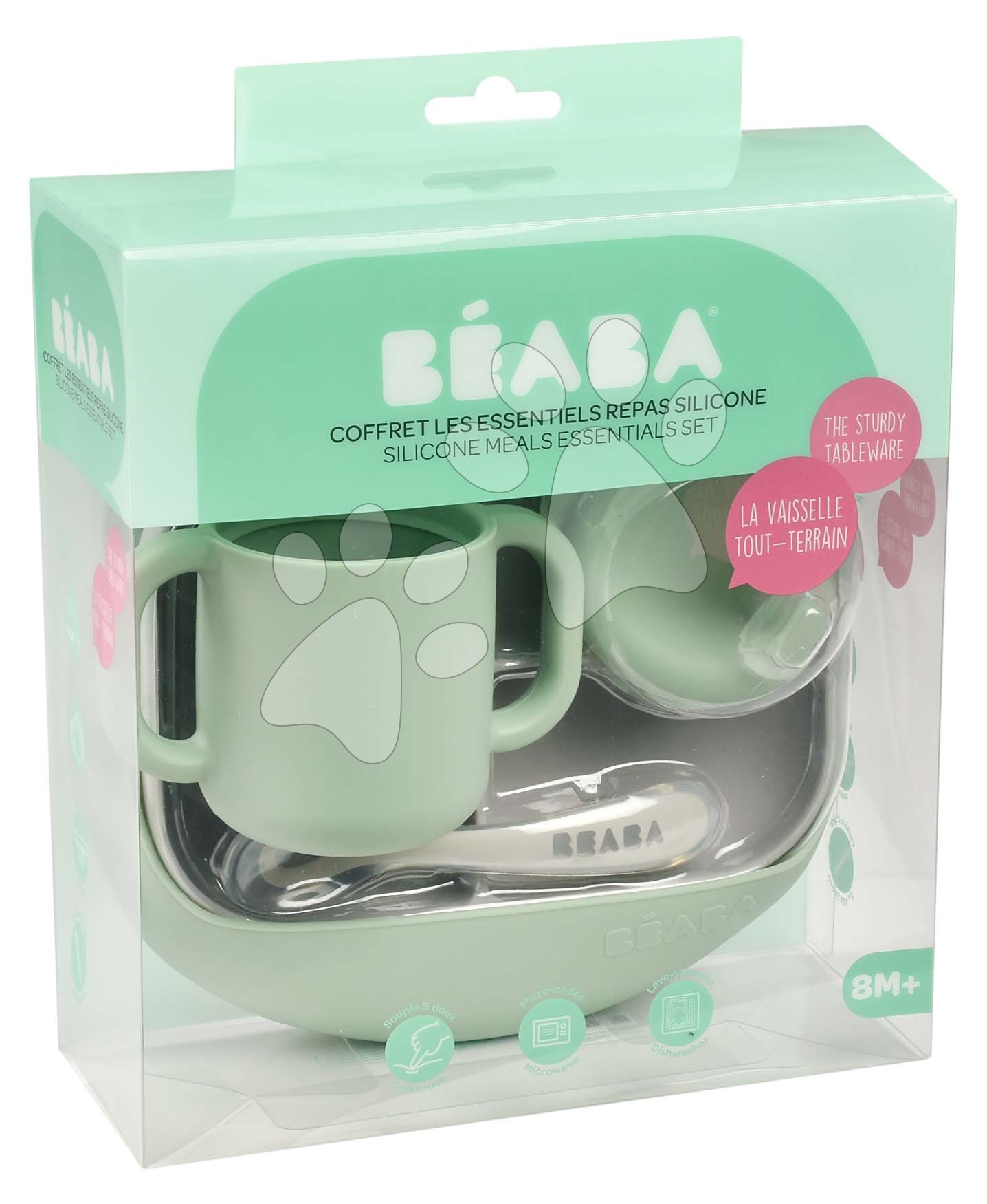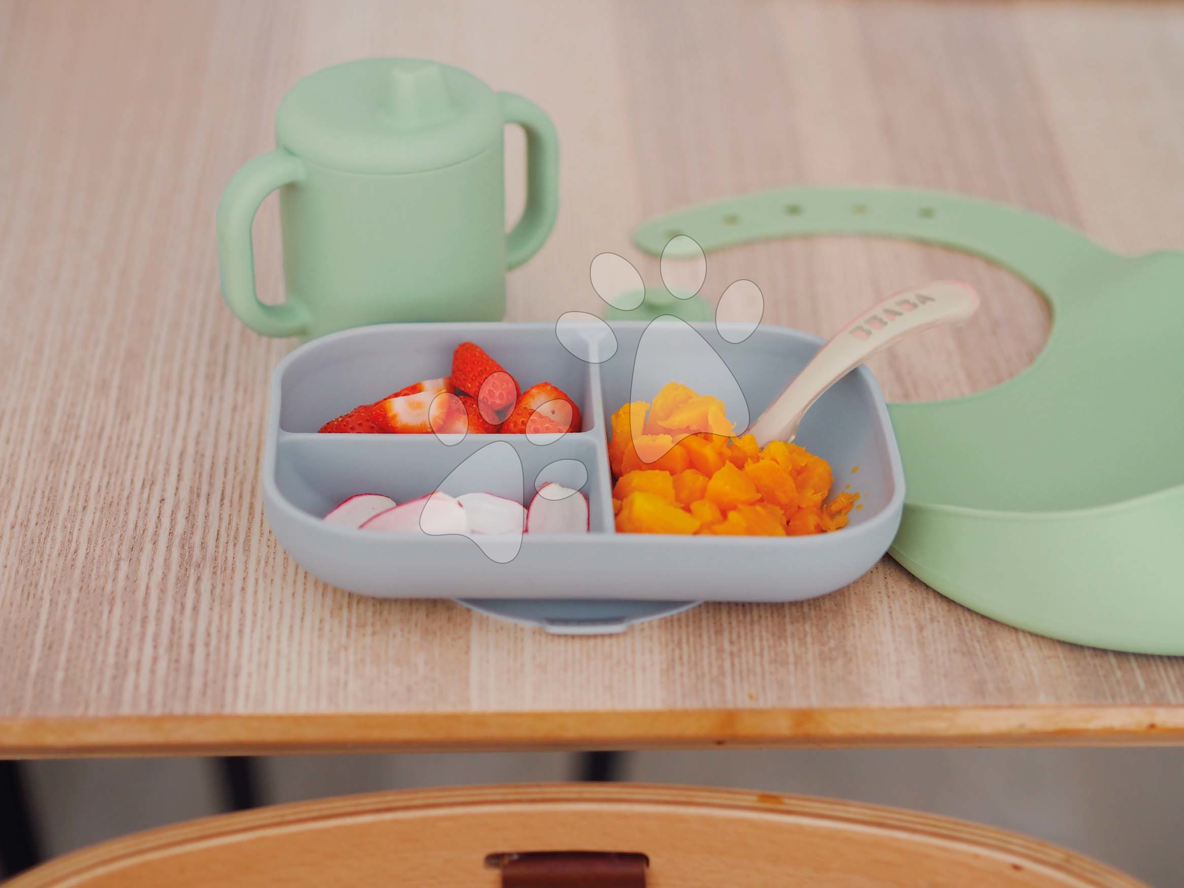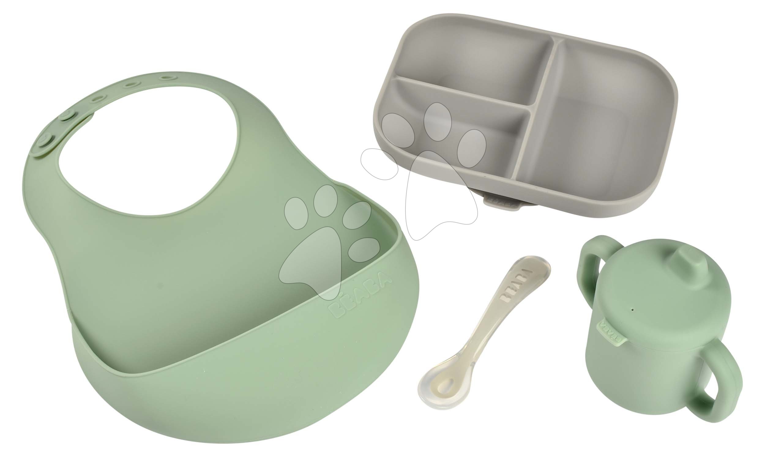 Jídelní souprava Silicone Meal Essentials Set Beaba s hrníčkem a talířem se lžičkou a bryndák zeleno-šedá od 8 měsíců