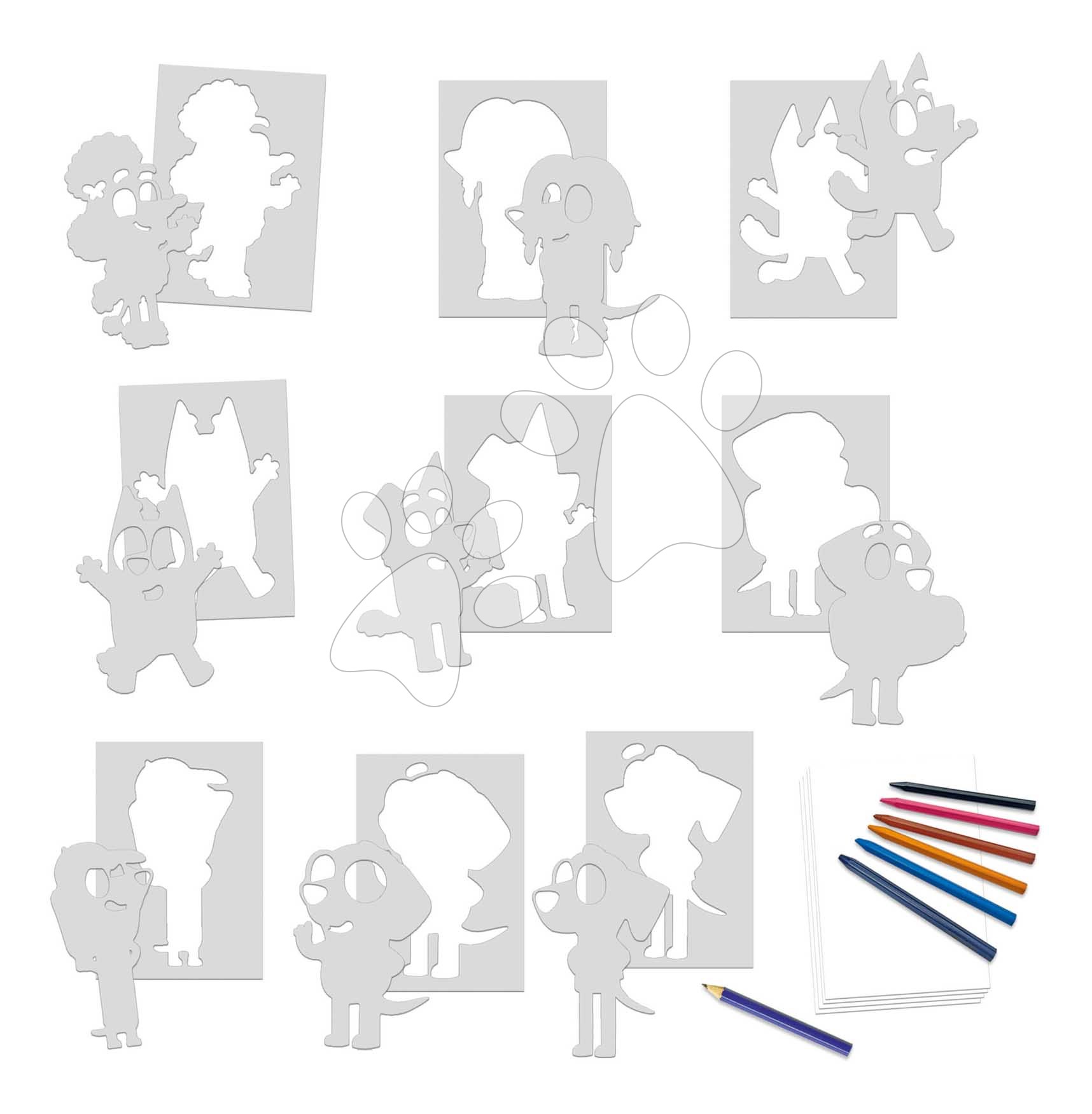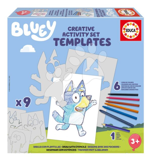 Kreatívne tvorenie Stencil Bluey Activity Set Educa vyfarbi si psíka Bluey so 6 farebnými voskovkami 8 rôznych modelov od 24 mes EDU19886