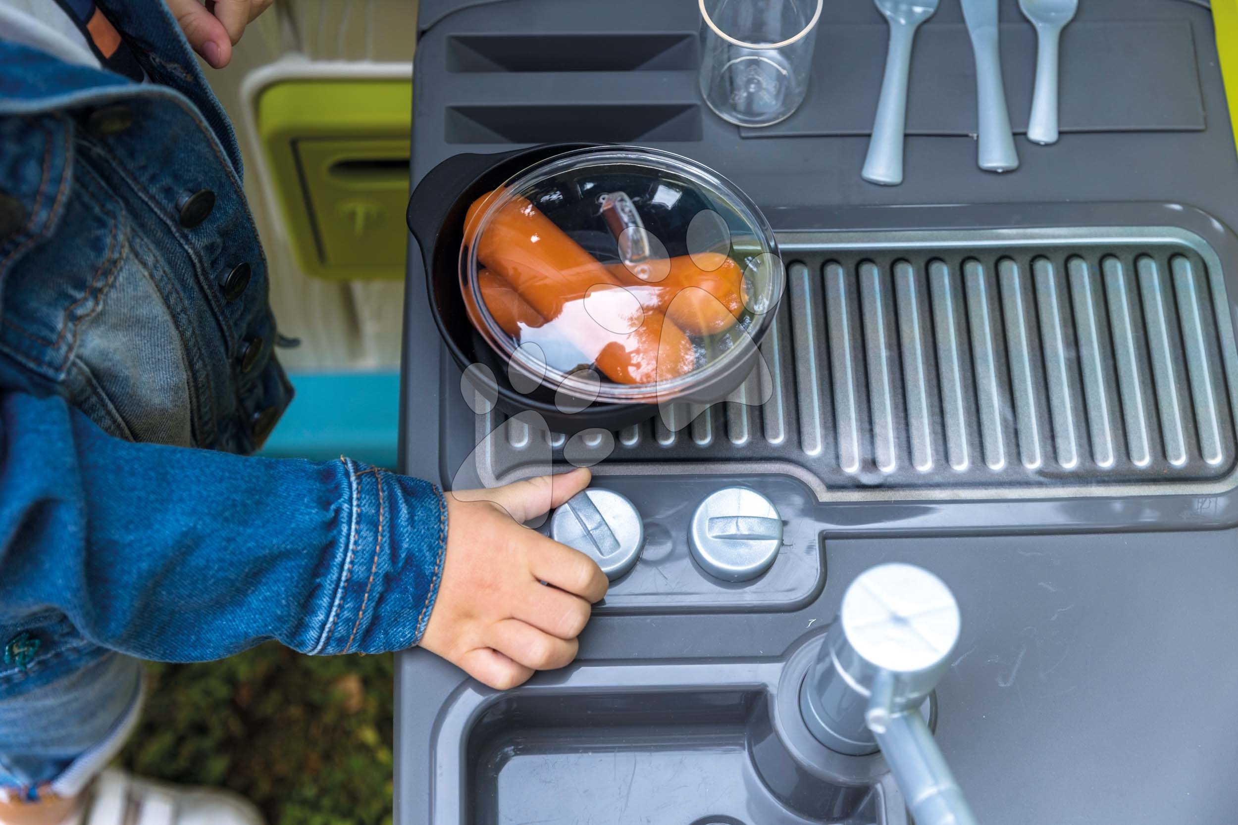 Kuchyňka letní se 17 doplňky Summer Kitchen k domečkům Smoby s varnou deskou a dřez na mytí nádobí s UV filtrem od 24 měsíců