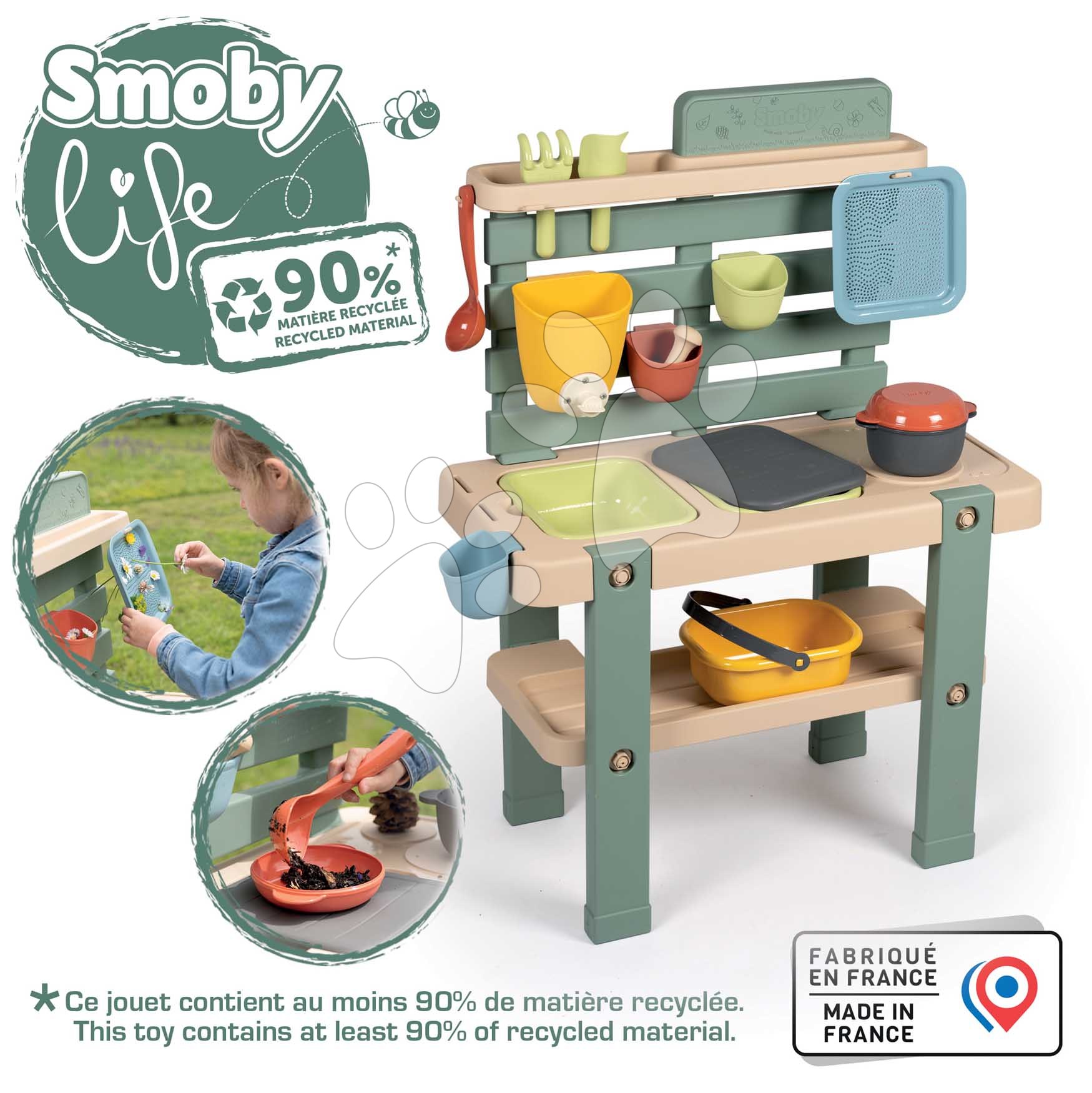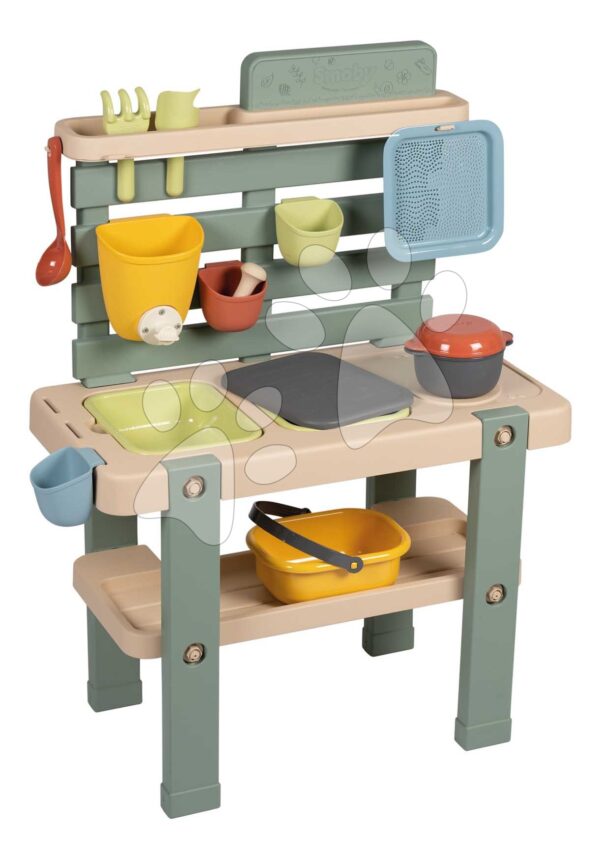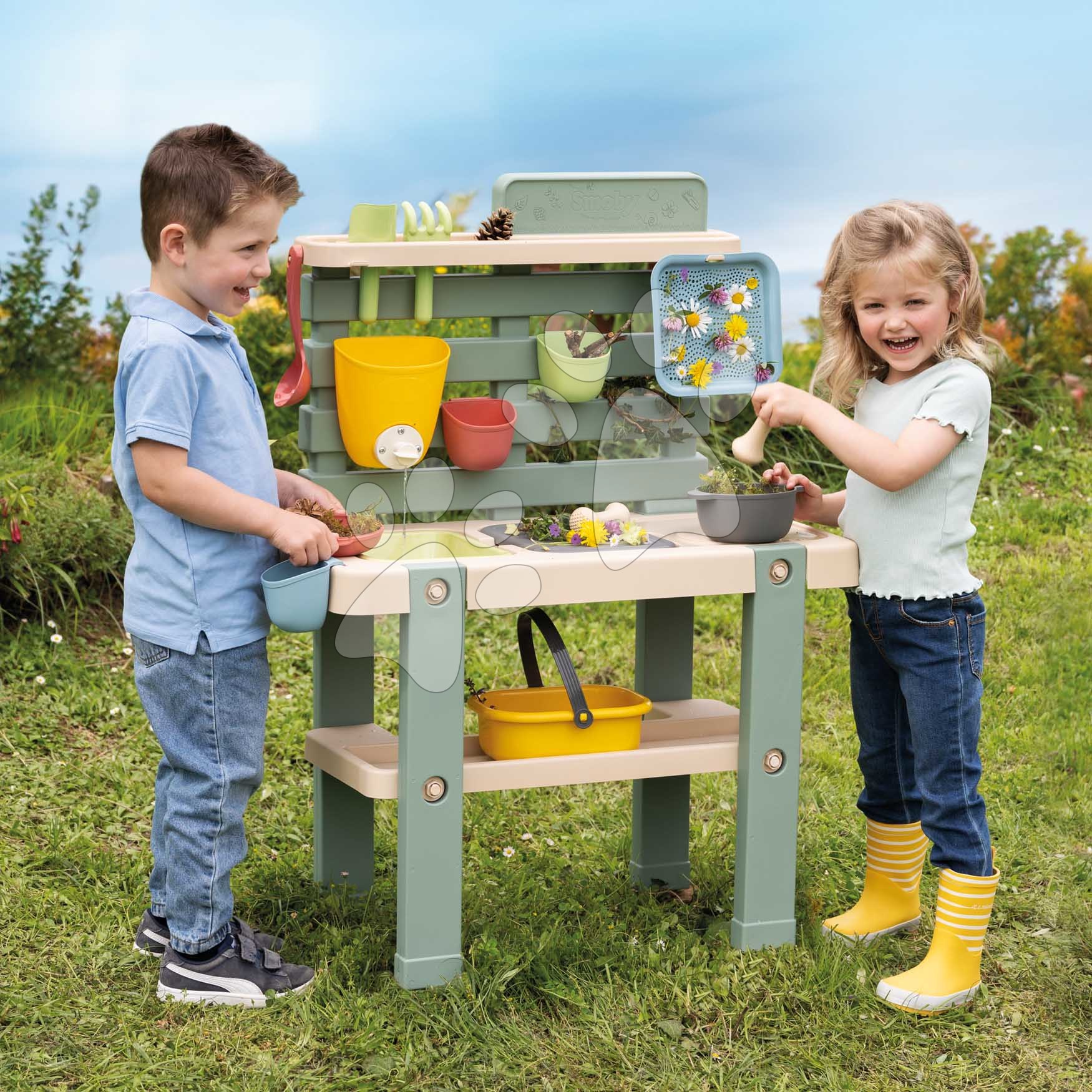 Kuchyňka pro zahradníky Mud Kitchen Life Smoby hra s trávou květinami a pískem 15 doplňků s nářadím a nádrží na vodu od 3 let – model 2025