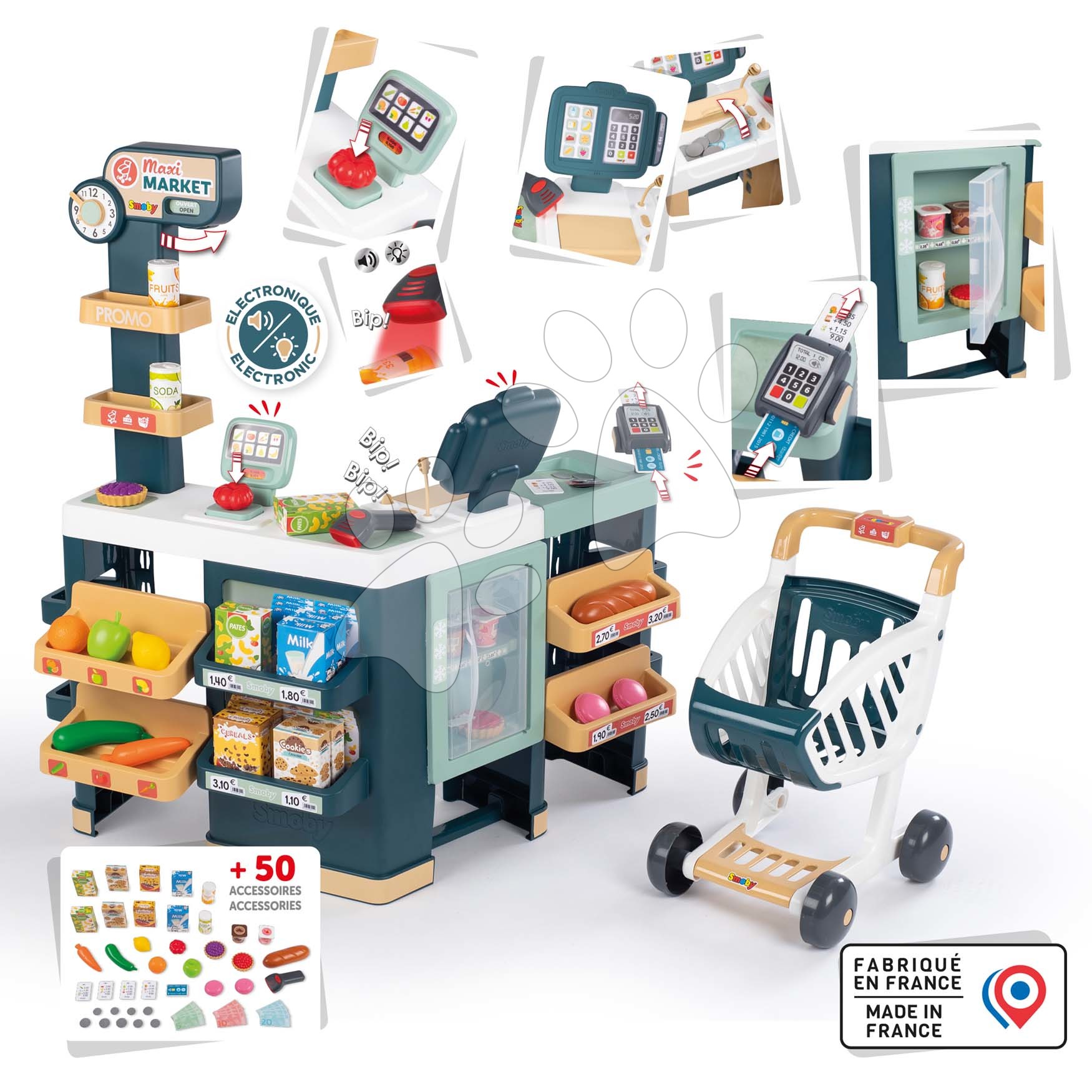 Obchod elektronický smíšené zboží s chladničkou Maxi Market Smoby s pokladnou váhou skenerem a 50 doplňků 90 cm výška