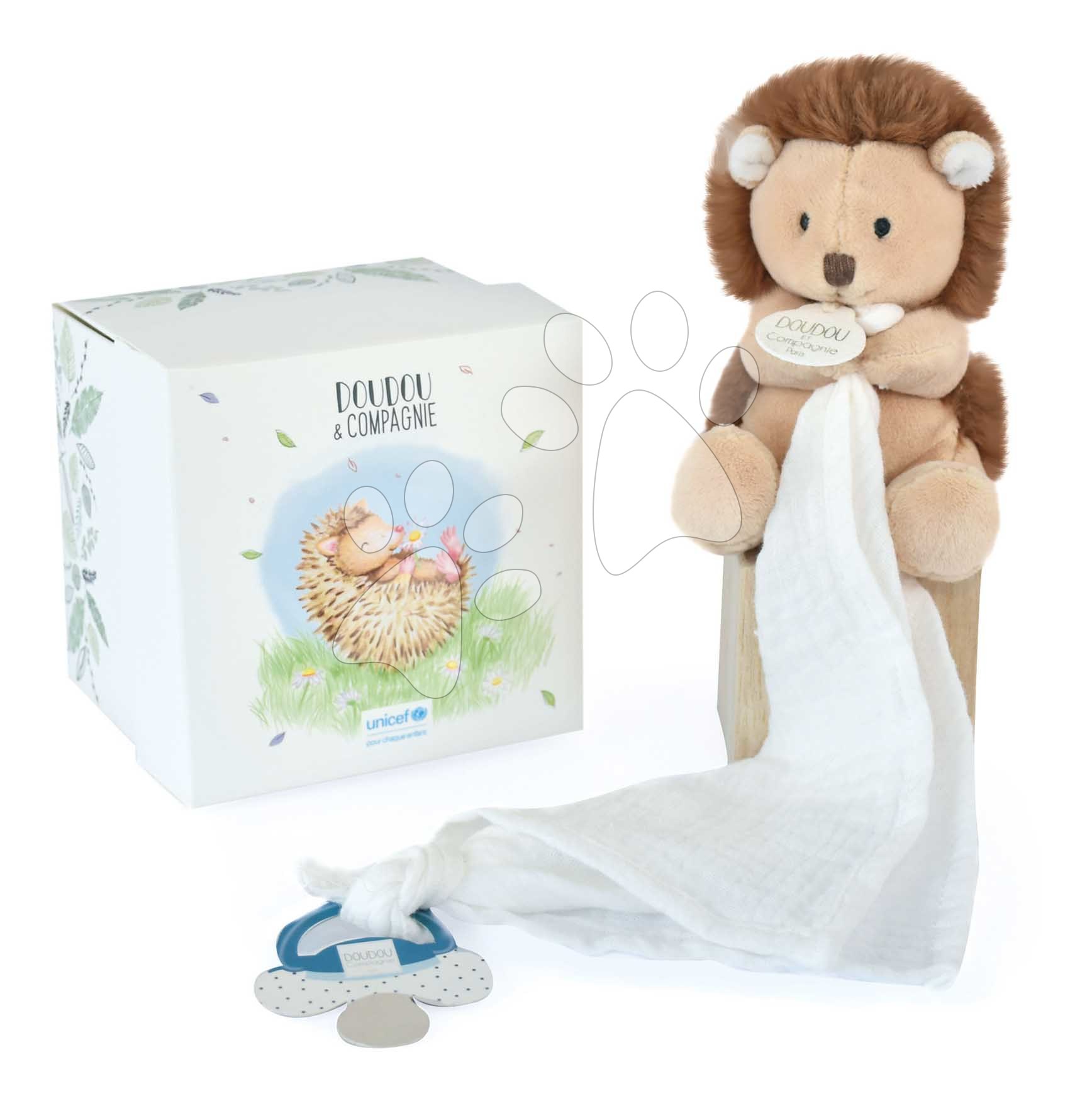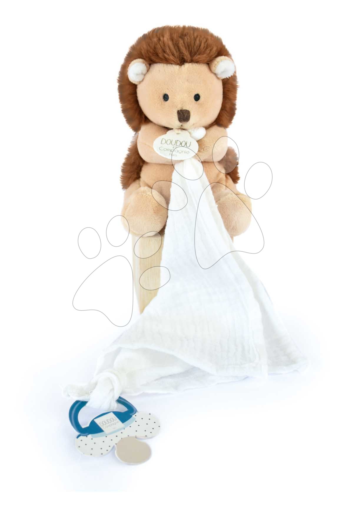 Milovaný dudlík bude od nynějška navždy připoután k oblíbené hračce. Krásný plyšový ježek Doudou et Compagnie má šňůrku na dudlík a hadřík na mazlení.