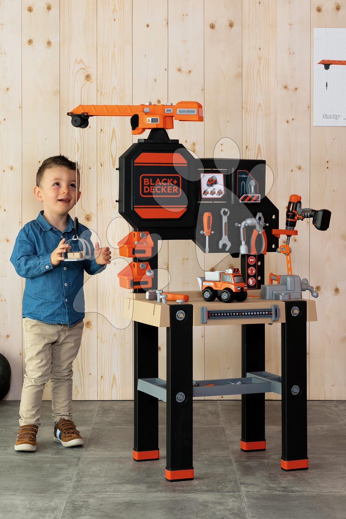 Pracovní stůl s funkčním jeřábem Black&Decker Bricolo Builder Smoby se stavebnicí auto a vrtačkou a 94 doplňků 117 cm výška