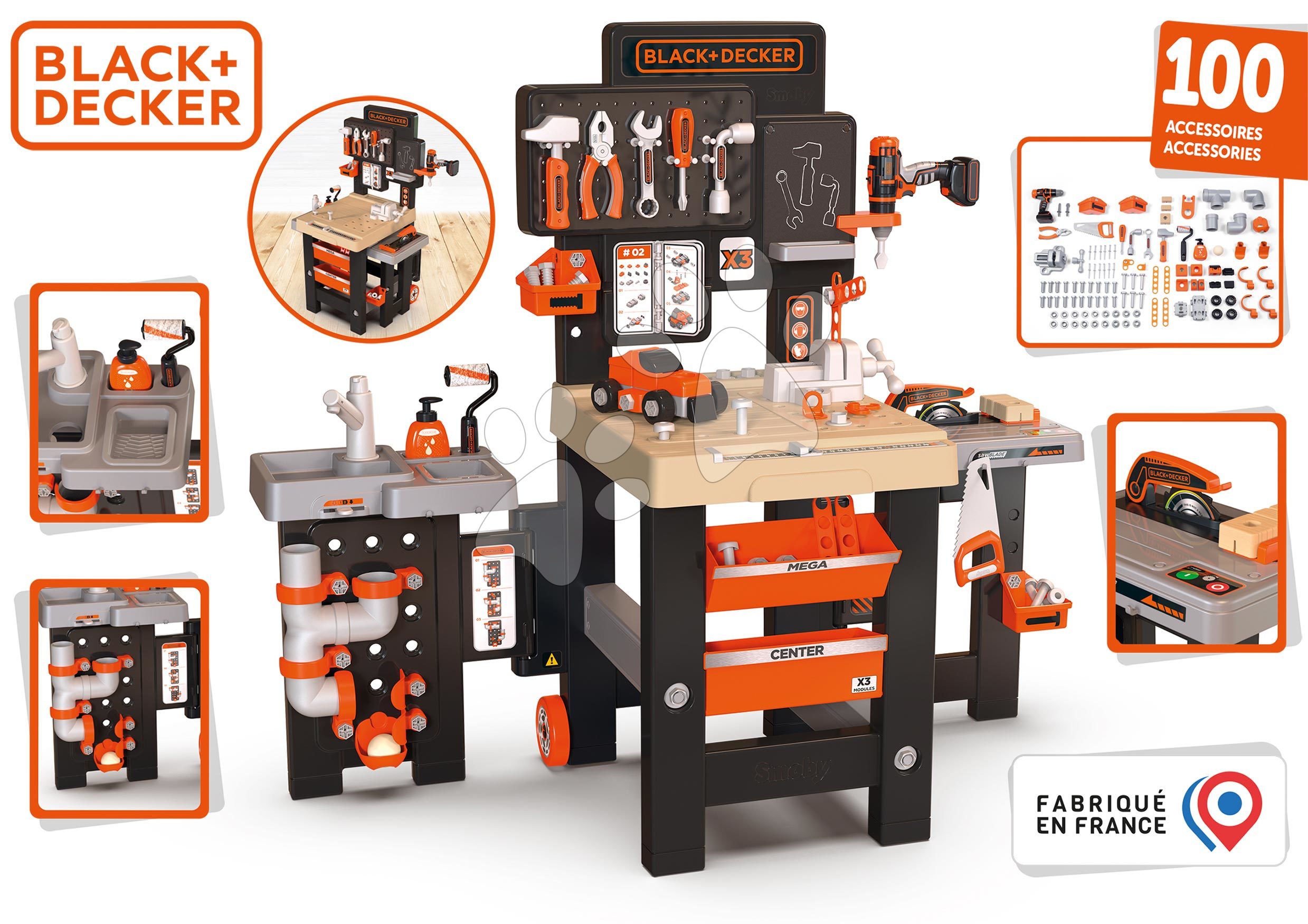 Pracovní stůl trojkřídlý Black&Decker Mega Center Smoby strojírenství instalatérství malování a tesařství 100 doplňků 103 cm výška