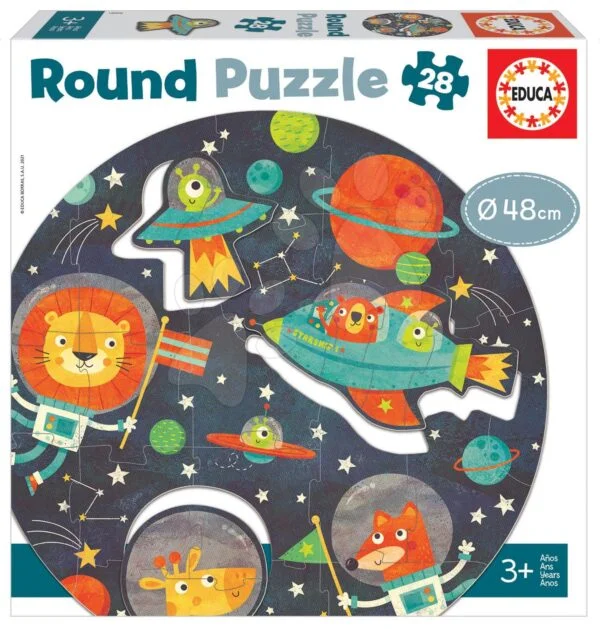 kulaté puzzle od Educa zabaví děti již od 3 let. 28dílné puzzle pro nejmenší The Space Round s obrázkem zvířátek ve vesmíru mají průměr 48 cm.