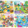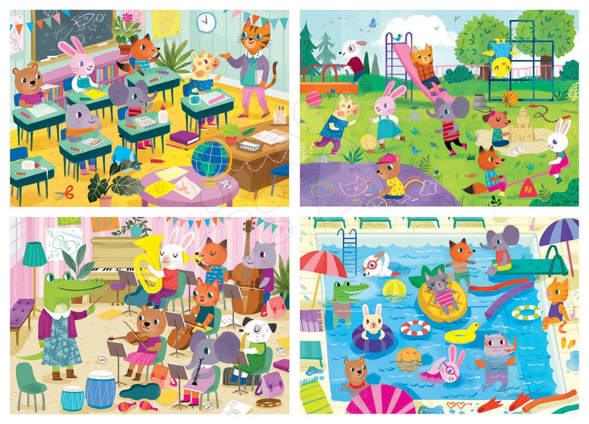 Progresivní puzzle Educa rostou s dítětem od 3 let. Puzzle škola School Day obsahuje 4 druhy obrázků zvířátek – školáky s 20, 40, 60 a 80 dílky puzzle.