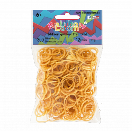 Hledáte kvalitní a originální gumičky na výrobu dětských náramků? Rainbow Loom gumičky ve zlaté barvě s třpytkami jsou ideální pro výrobu silikonových náramků.