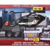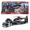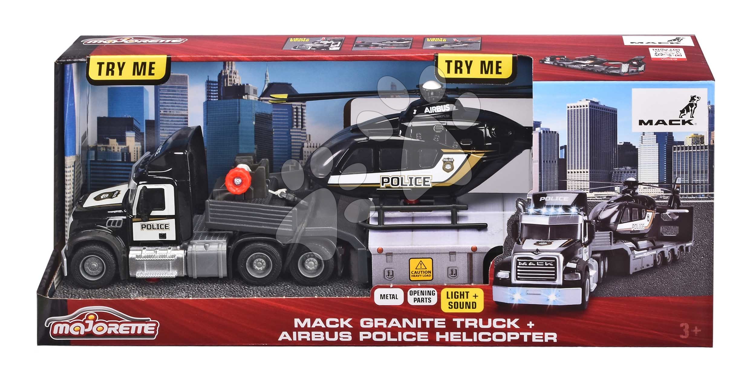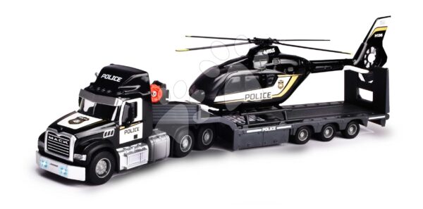 Tahač s přívěsem a policejní helikoptéra Mack Truck Police Helicopter Majorette se zvukem a světlem s gumovými kolečky délka 35 cm