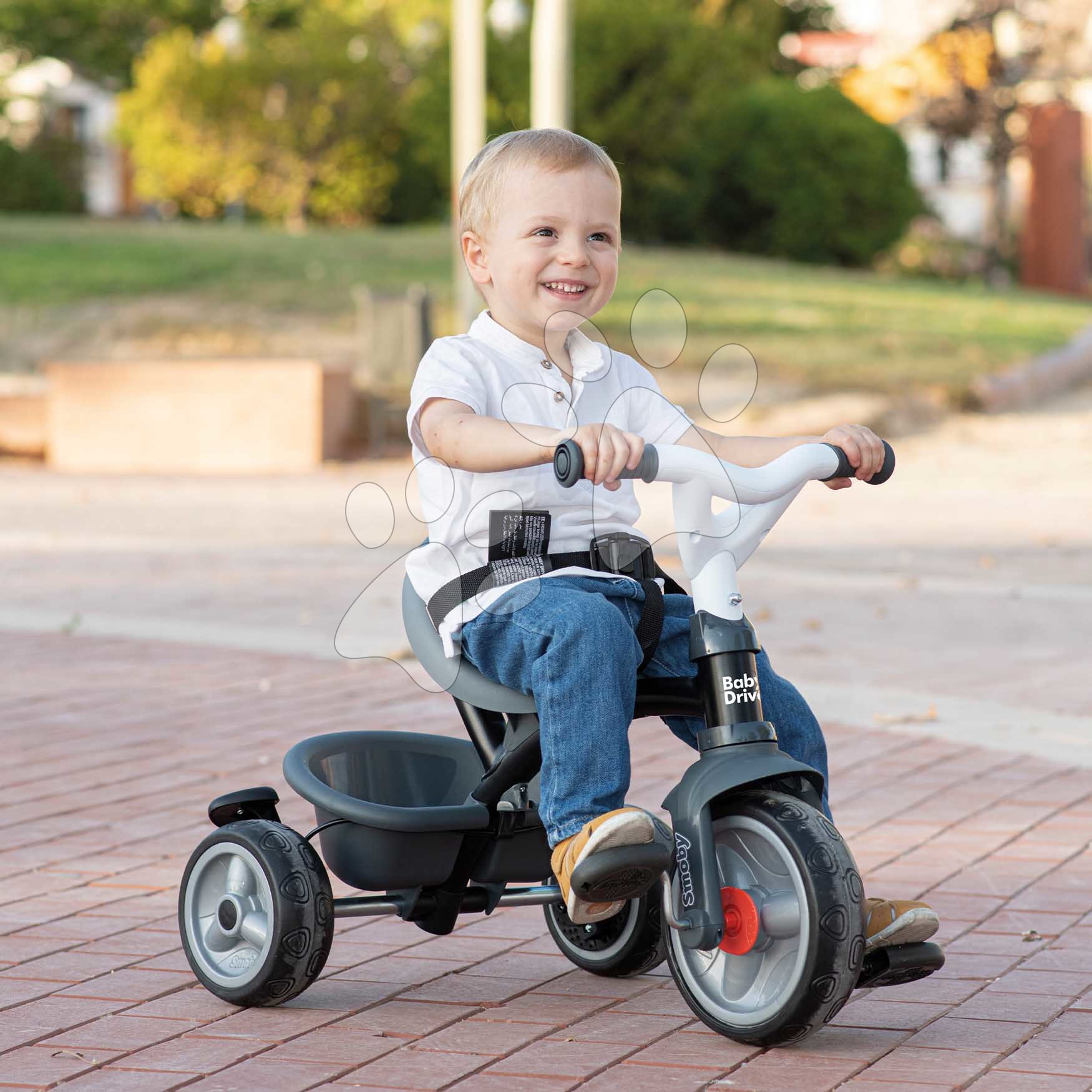 Tříkolka a kočárek v jednom s brzdou Baby Driver Grey Tricycle Smoby s intuitivním ovládáním a tichými EVA kolečky šedá od 10 měsíců