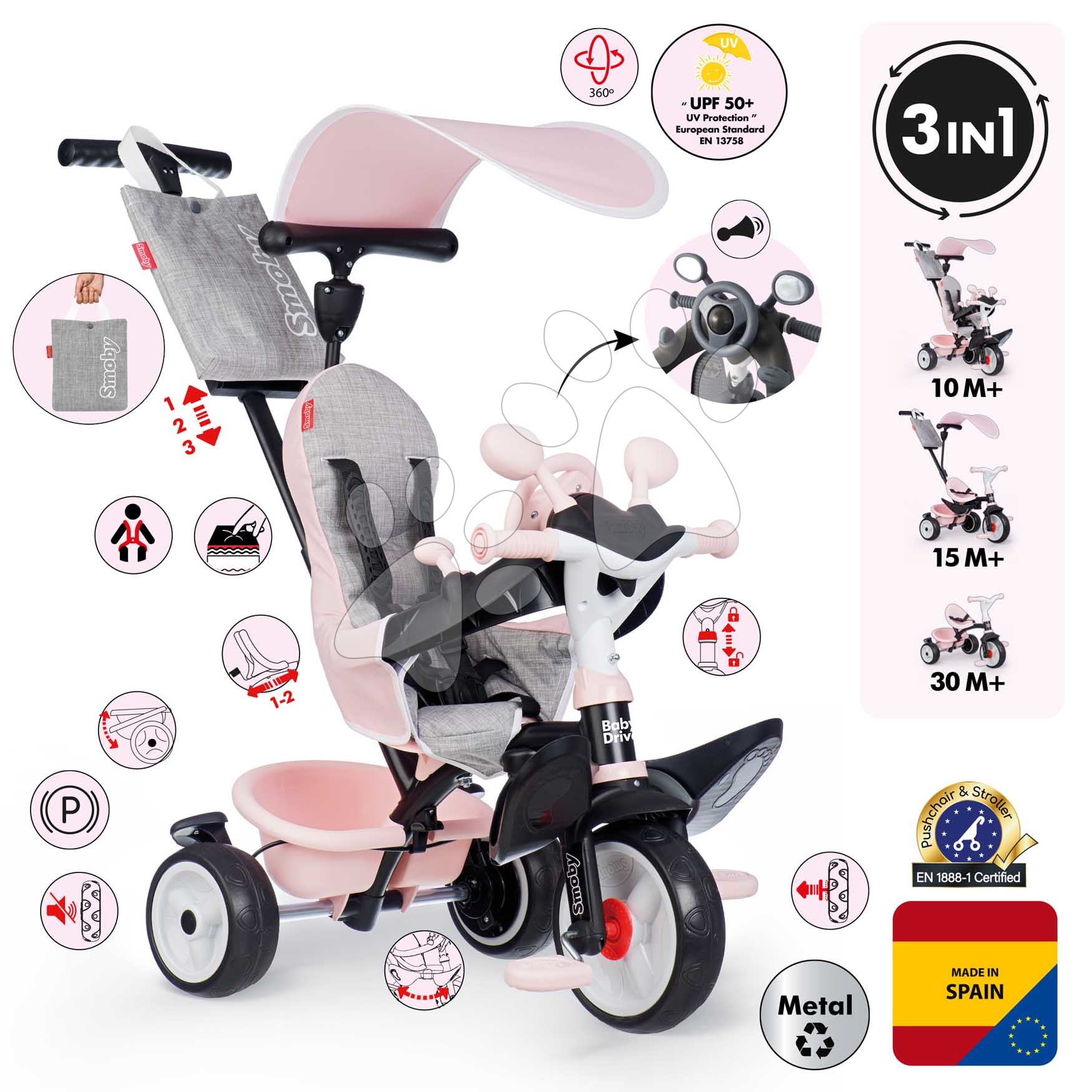 Tříkolka a kočárek v jednom s brzdou Baby Driver Pink Tricycle Smoby s intuitivním ovládáním a tichými EVA kolečky růžová od 10 měsíců