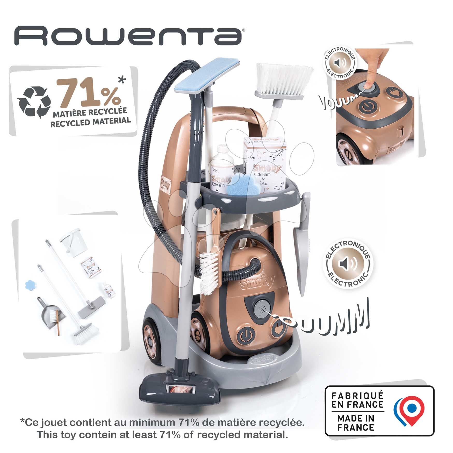 Úklidový vozík a elektronický vysavač Rowenta Vacuum Cleaner Smoby s realistickým zvukem se smetákem lopatkou a 9 doplňky
