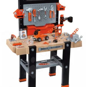 • Pracovní dílna s mechanickou vrtačkou Black&Decker Bricolo Center Workbench Smoby se zatloukačkou a skládacím autíčkem 92 doplňků 103 cm výška